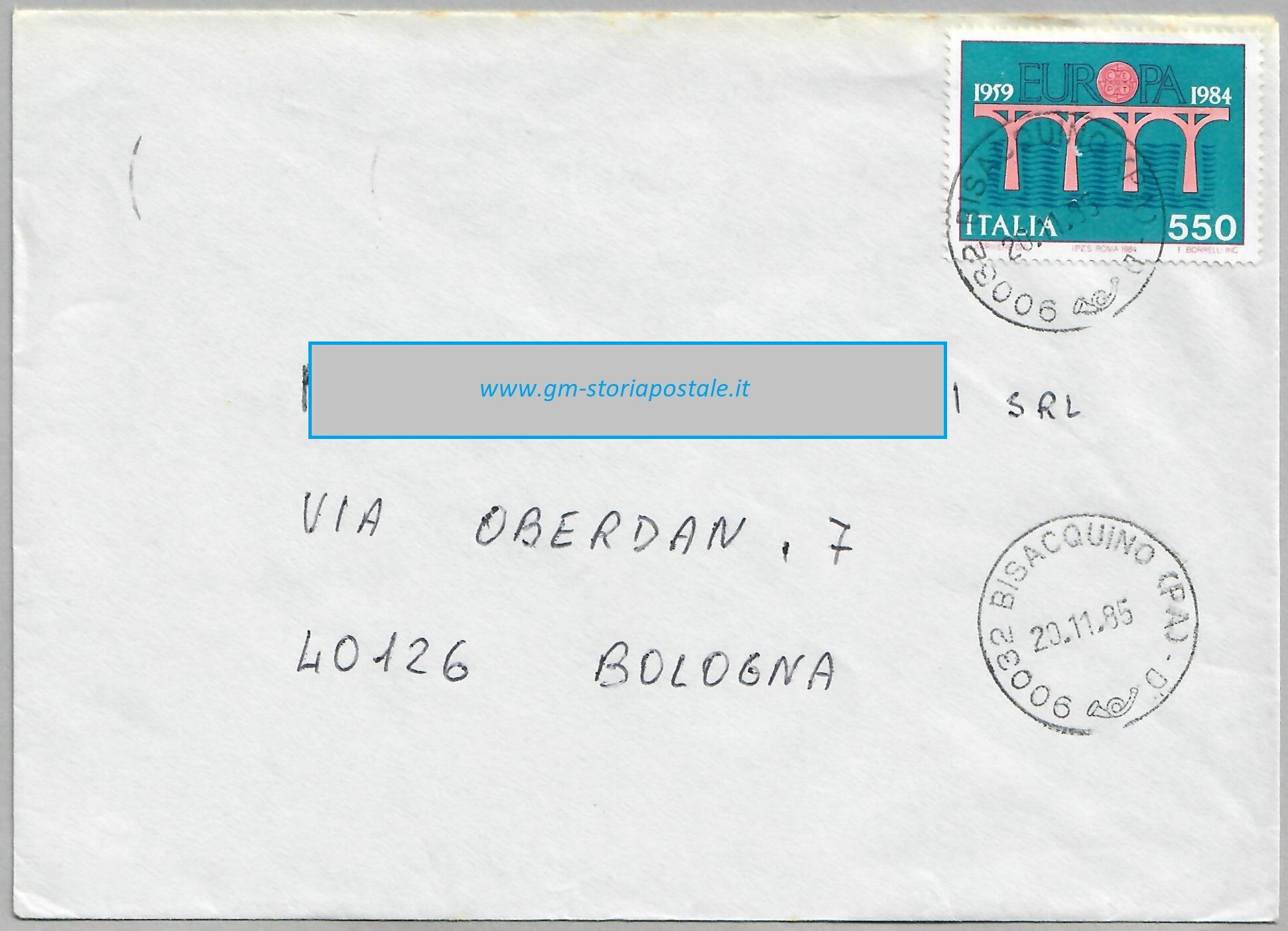 Tra il 13 novembre 1985 ed il 15 novembre 1986 la tariffa per affrancare una lettera primo porto per l’interno era di 550 lire. L’esemplare sotto riportato fu spedito da Bisacquino il 20 novembre 1985 per Bologna, dove giunse il 22 novembre successivo.
