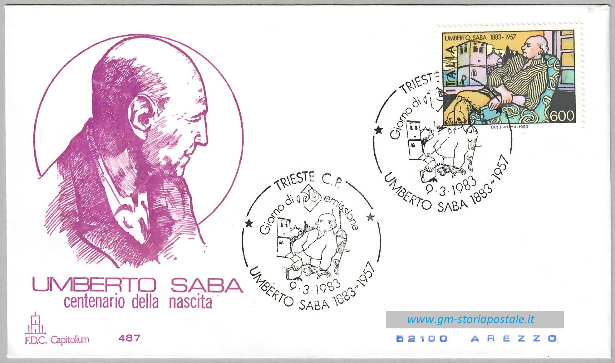 Il francobollo commemorativo da 450 lire dedicato al centenario della nascita di Umberto Saba fu emesso il 9 marzo 1983 con validità permanente. L’annullo speciale per il primo giorno di emissione fu in uso a Trieste.