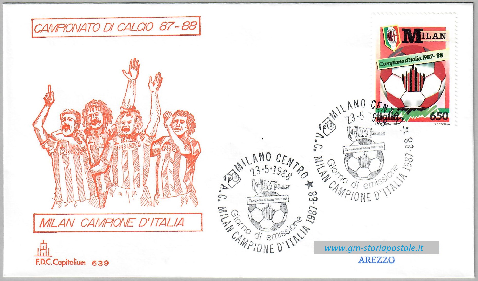 Il francobollo commemorativo da 650 lire dedicato alla vittoria del Milan nel campionato di calcio 1987-1988 fu emesso il 23 maggio 1988 con validità permanente. L’annullo speciale per il primo giorno di emissione fu in uso a Milano.