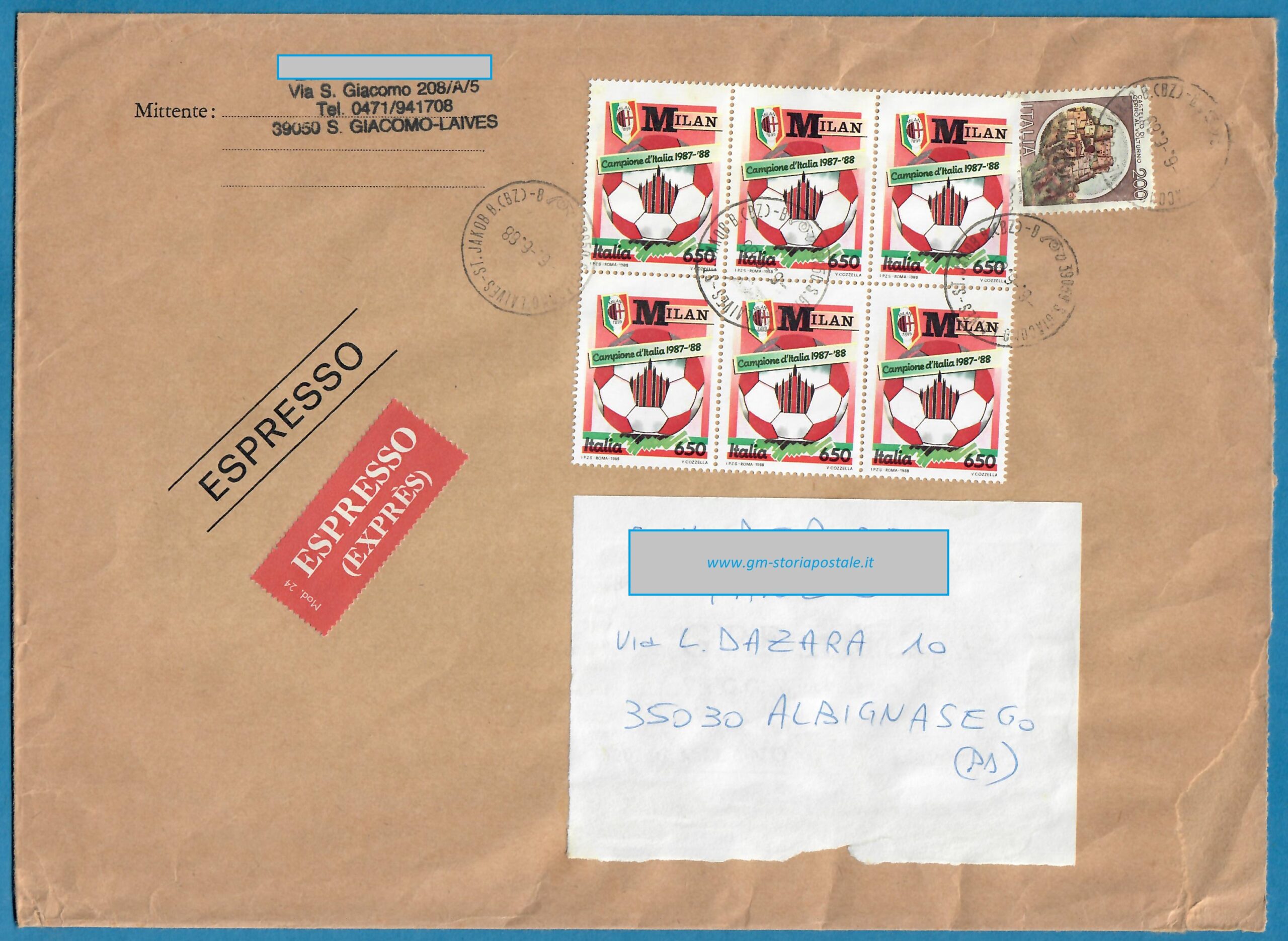 Tra il 1° marzo 1988 ed il 31 dicembre 1989 la tariffa per affrancare una lettera tra 50 e 100 grammi era di 1700 lire mentre latra 1l 16 novembre 1986 ed il 31 dicembre 1989 la soprattassa per il recapito espresso ammontava a 2400 lire: vi fu quindi un periodo in cui la lettera tra 50 e 100 grammi espresso si affrancava con 4100 lire. L’esemplare sotto riportato fu spedito da San Giacomo Laives il 6 giugno 1988 per Albignasego, dove giunse l’8 giugno successivo.