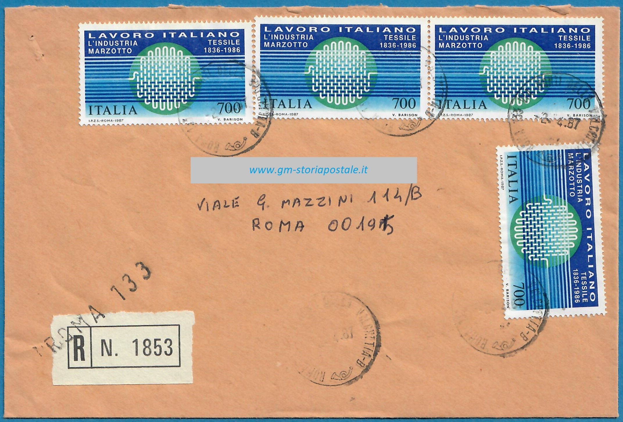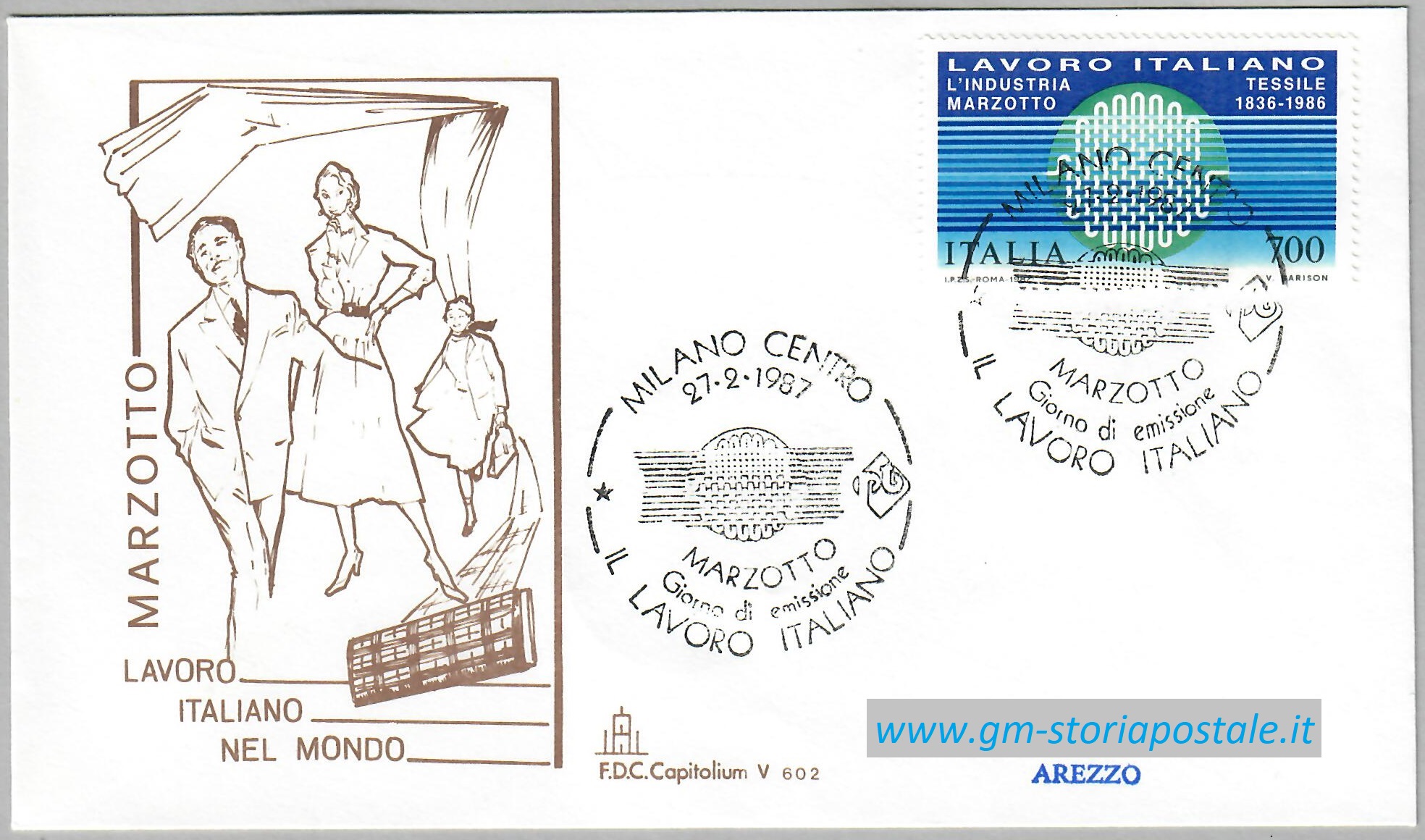 Il francobollo commemorativo da 700 lire dedicato all’industria tessile Marzotto, della serie del Lavoro Italiano nel Mondo del 1987, fu emesso il 27 febbraio 1987 con validità permanente. L’annullo speciale per il primo giorno di emissione fu in uso a Milano.