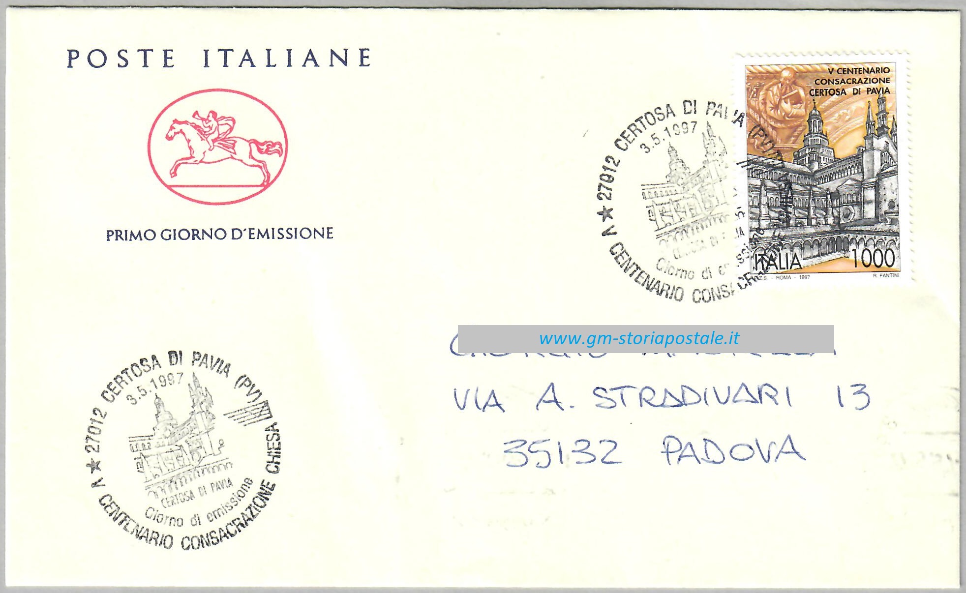 Il francobollo commemorativo da 1000 lire dedicato al 5° centenario della consacrazione della Certosa di Pavia fu emesso il 3 maggio 1997 con validità permanente. L’annullo speciale per il primo giorno di emissione fu in uso presso la Certosa di Pavia.