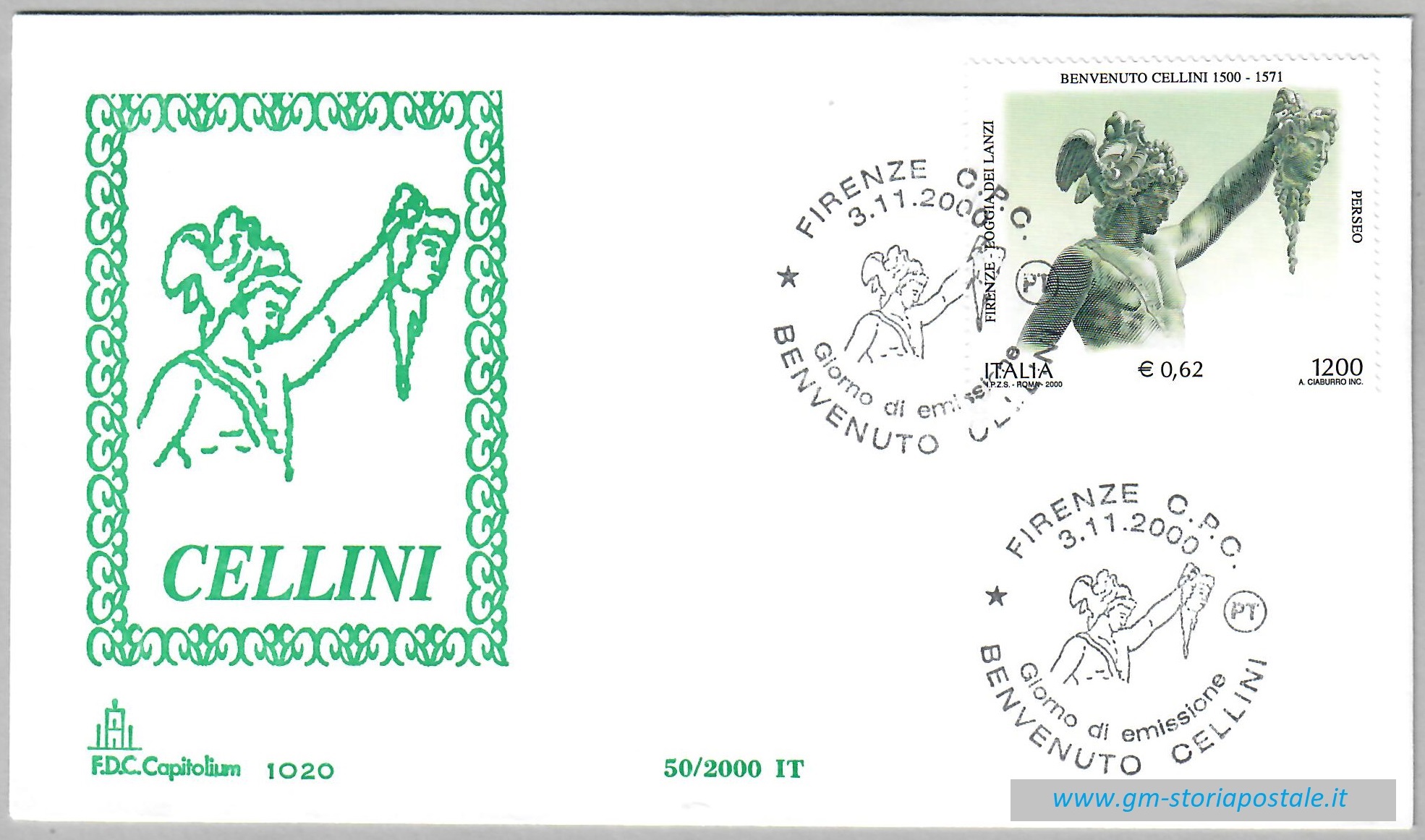 Il francobollo commemorativo da 1200blire dedicato al 500° anniversario della nascita di Benvenuto Cellini fu emesso il 3 novembre 2000 con validità permanente. L’annullo speciale per il primo giorno di emissione fu in uso a Firenze.