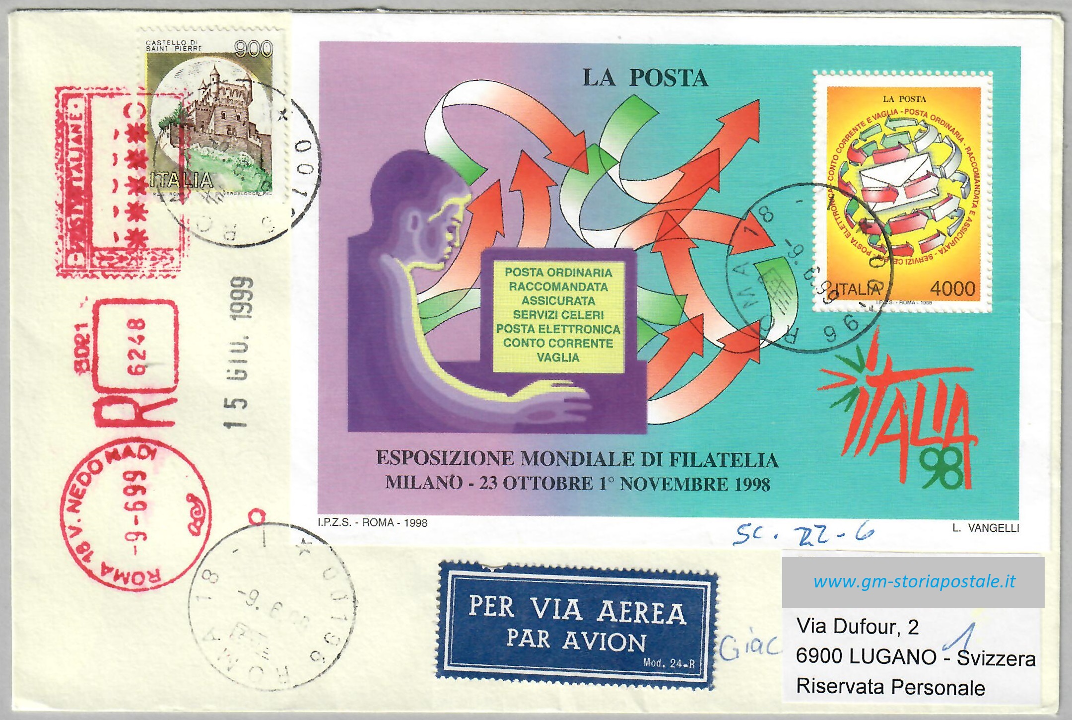Tra il 5 maggio 1997 ed il 14 febbraio 2000 la tariffa per affrancare una lettera primo porto per l’estero era di 900 lire: vi fu quindi un periodo in cui la lettera primo porto raccomandata per l’estero si affrancava con 4900 lire. L’esemplare sotto riportato fu spedito da Roma il 9 giugno 1999 per la Svizzera.