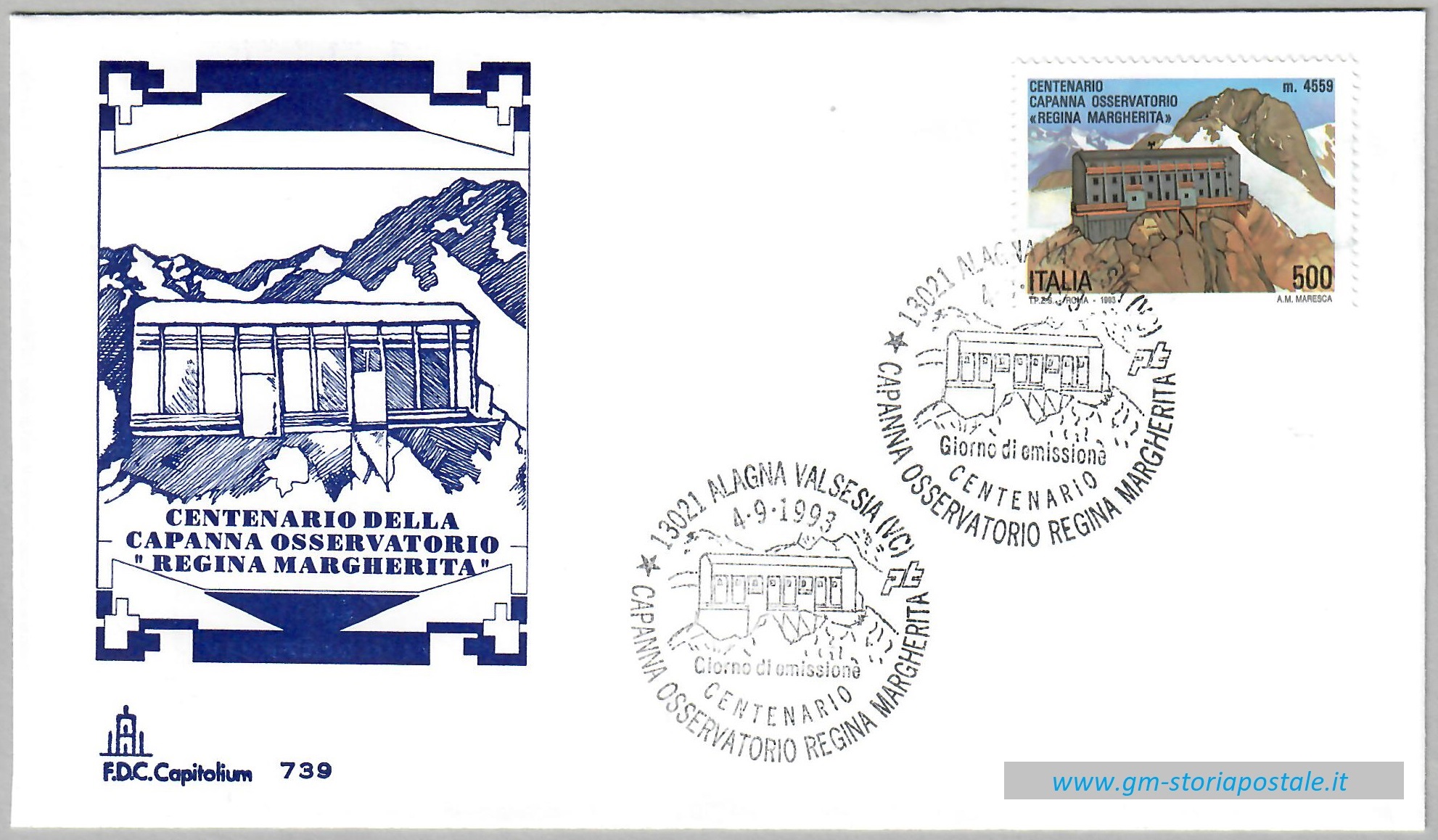 Il francobollo commemorativo da 500 lire dedicato al centenario della costituzione dell’Osservatorio Regina Margherita in Valsesia fu emesso il 4 settembre 1993 con validità permanente. L’annullo speciale per il primo giorno di emissione fu in uso a Alagna Valsesia.