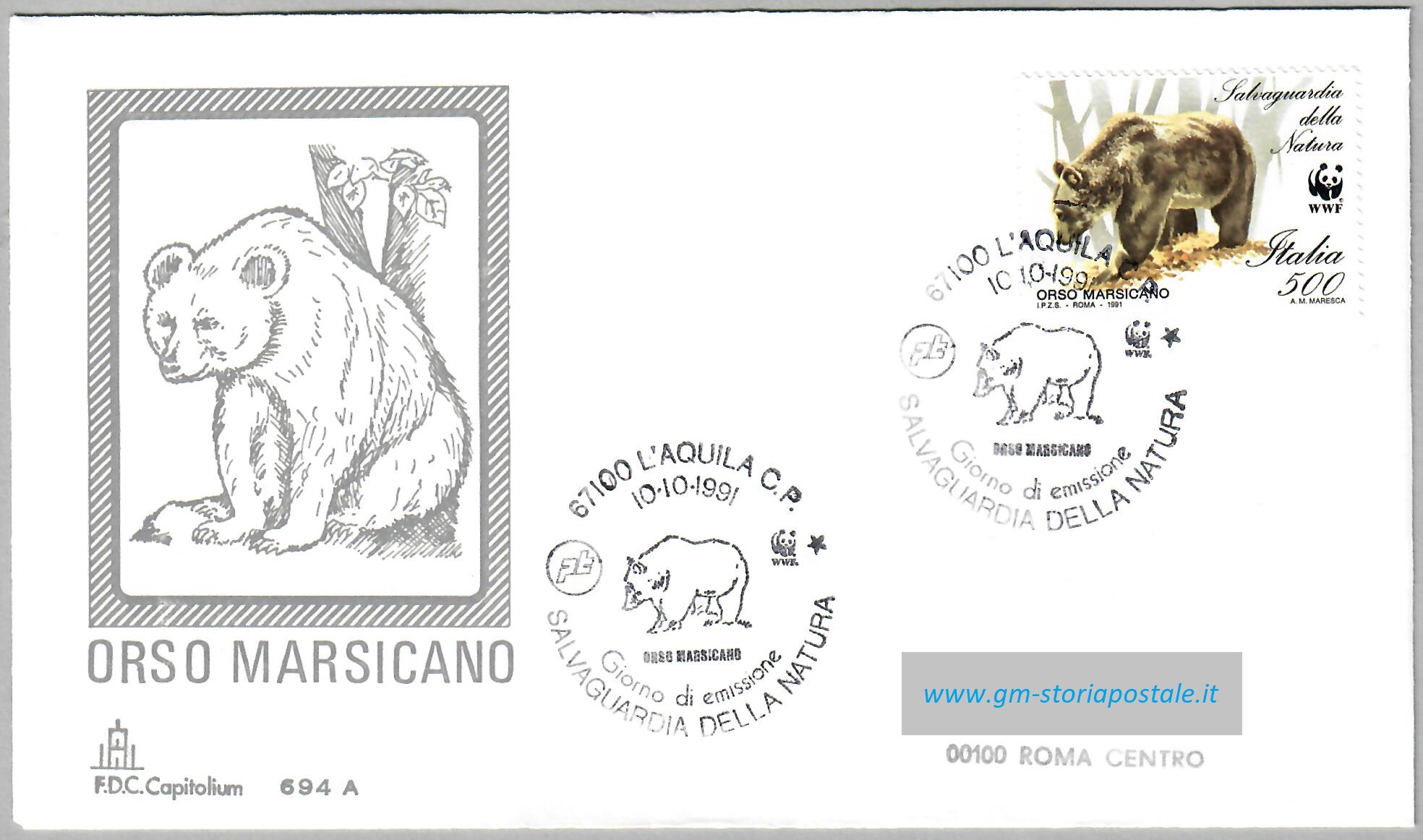 Il francobollo commemorativo da 500 lire della serie “Salvaguardia della Natura” dedicato all’orso marsicano fu emesso il 10 ottobre 1991 con validità permanente. L’annullo speciale per il primo giorno di emissione fu in uso a L’Aquila.