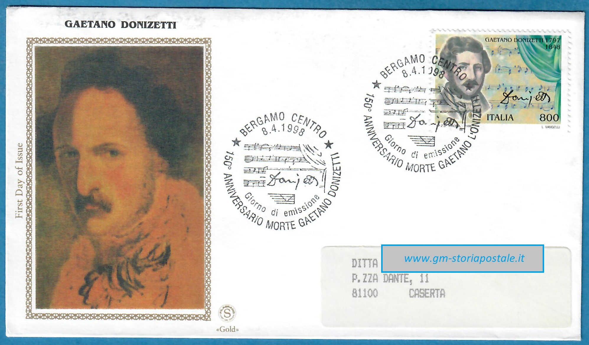 Il francobollo commemorativo da 800 lire dedicato a Gaetano Donizetti fu emesso l’8 aprile 1998 con validità permanente. Lo stesso giorno fu emesso anche un francobollo per celebrare il 400° anniversario del melodramma ed una cartolina postale per celebrare la riapertura del Teatro della Fortuna di Fano. L’annullo speciale per il primo giorno di emissione del francobollo dedicato a Donizetti fu in uso a Bergamo. Le Poste Italiane avevano già dedicato un francobollo a Donizetti nel 1948, in occasione del 100° anniversario della morte.