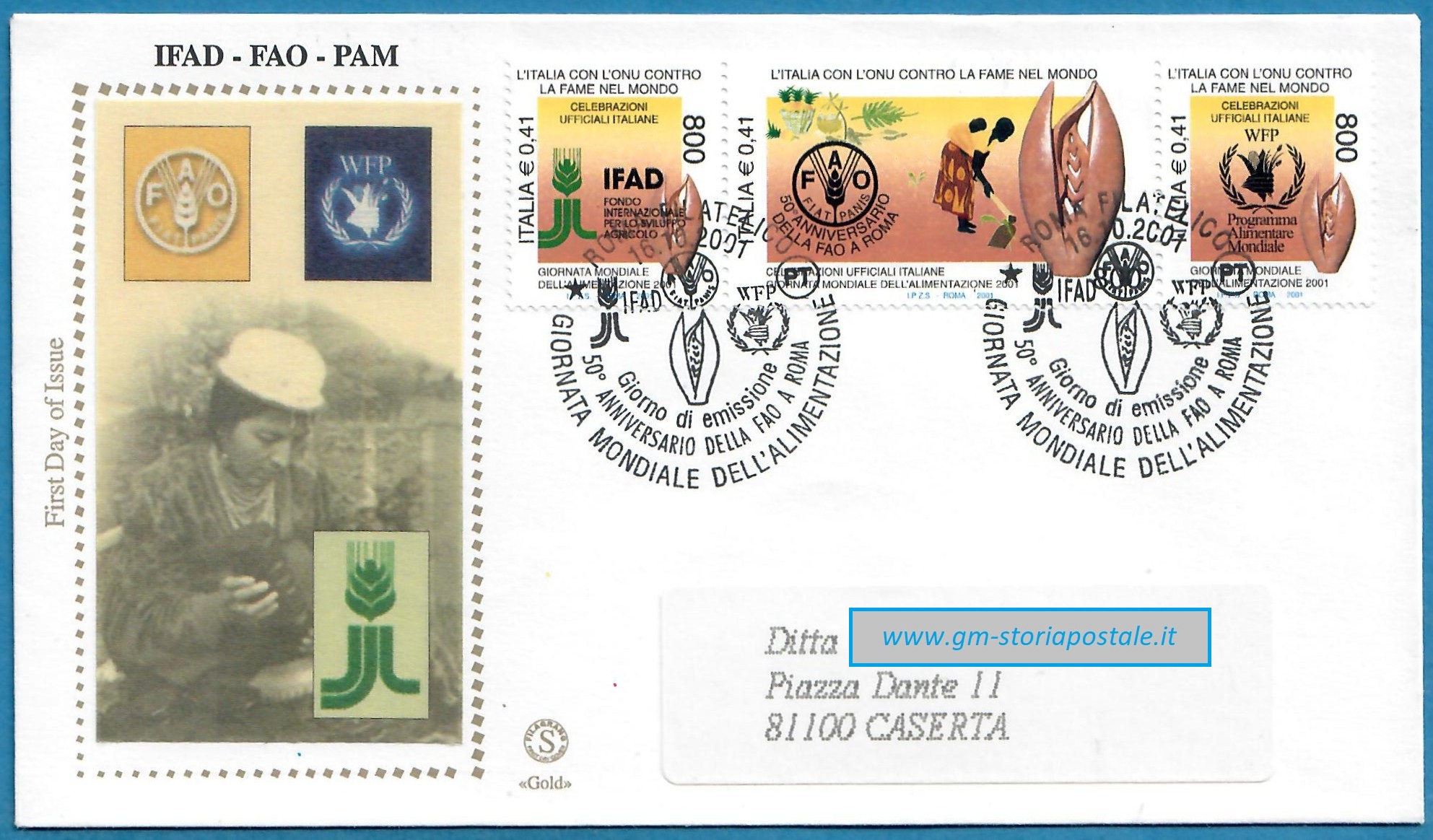 Il trittico di francobolli commemorativi da 800 lire dedicato alla Giornata Mondiale dell’Alimentazione fu emesso il 16 ottobre 2001 con validità permanente. I tre francobolli celebrano il Fondo Internazionale per lo Sviluppo Agricolo, la FAO ed il Programma Alimentare Mondiale. Il bollo speciale per il giorno di emissione fu in uso all’Ufficio Filatelico di Roma.
