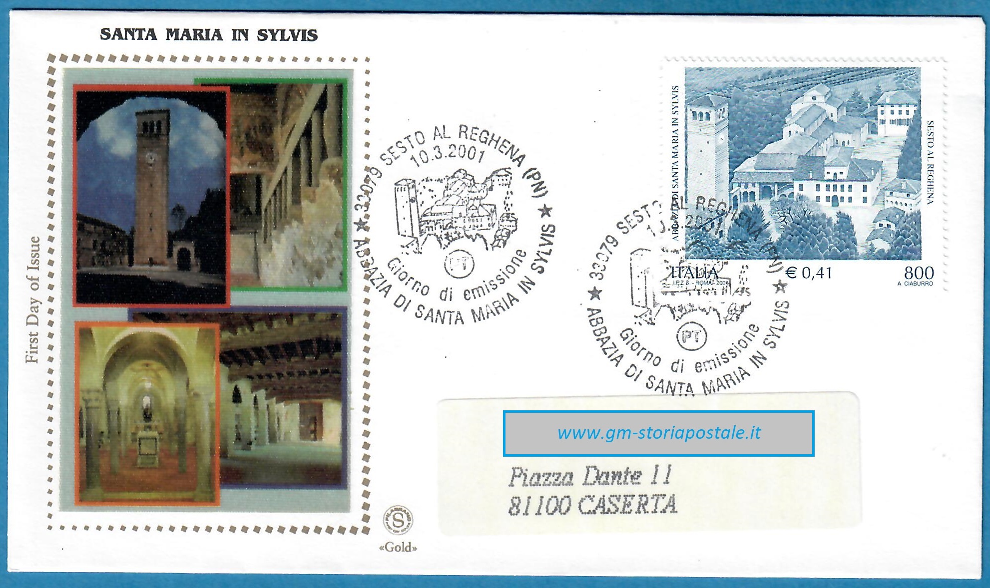 Il francobollo commemorativo da 800 lire dedicato all’Abbazia di Santa Maria in Sylvia a Sesto al Reghena fu emesso il 10 marzo 2001 con validità permanente. Il bollo speciale per il giorno di emissione fu in uso a Sesto al Reghena, il comune dove si trova l’Abbazia Benedettina.