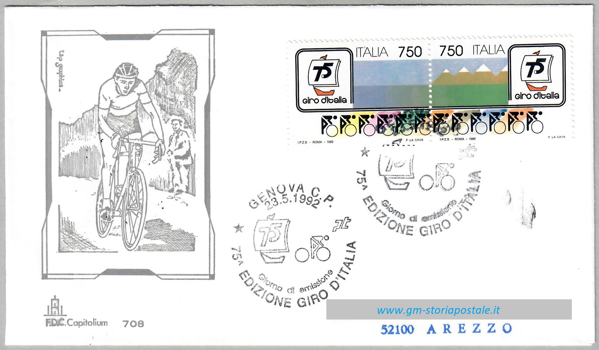 Il dittico di francobolli commemorativi da 750 lire dedicato al 75° Giro d’Italia di ciclismo fu emesso il 23 maggio 1992 con validità permanente. L’annullo speciale per il primo giorno di emissione fu in uso a Genova.