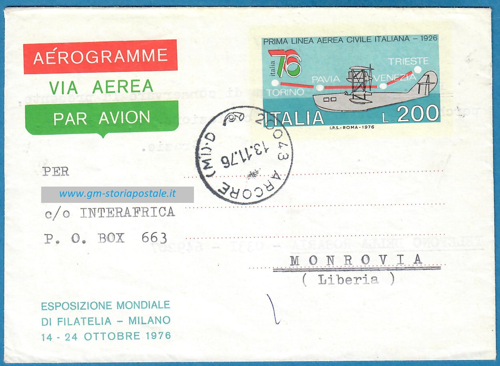Tra il 1° ottobre 1976 ed il 30 giugno 1978 la tariffa per affrancare un aerogramma era di 200 lire. L’esemplare sotto riportato fu spedito da Milano (annullo speciale) il 23 ottobre 1976 per Lugano, dove fu datato sul retro il 3 novembre successivo per giungere a Roma il 22 novembre. Sul retro, un timbro lineare indica “Volo non effettuato – Invio trasmesso per via di superficie”.