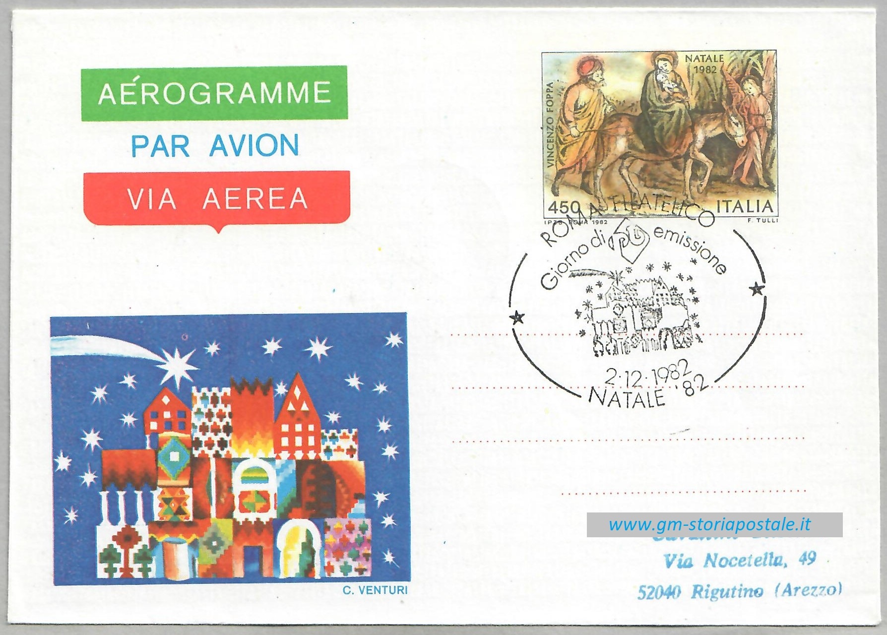 L’aerogramma da 450 lire dedicato al Natale 1982 fu emesso il 2 dicembre 1982 con validità permanente. L’annullo speciale per il primo giorno di emissione fu in uso a Roma e fu in comune con il biglietto postale emesso lo stesso giorno.