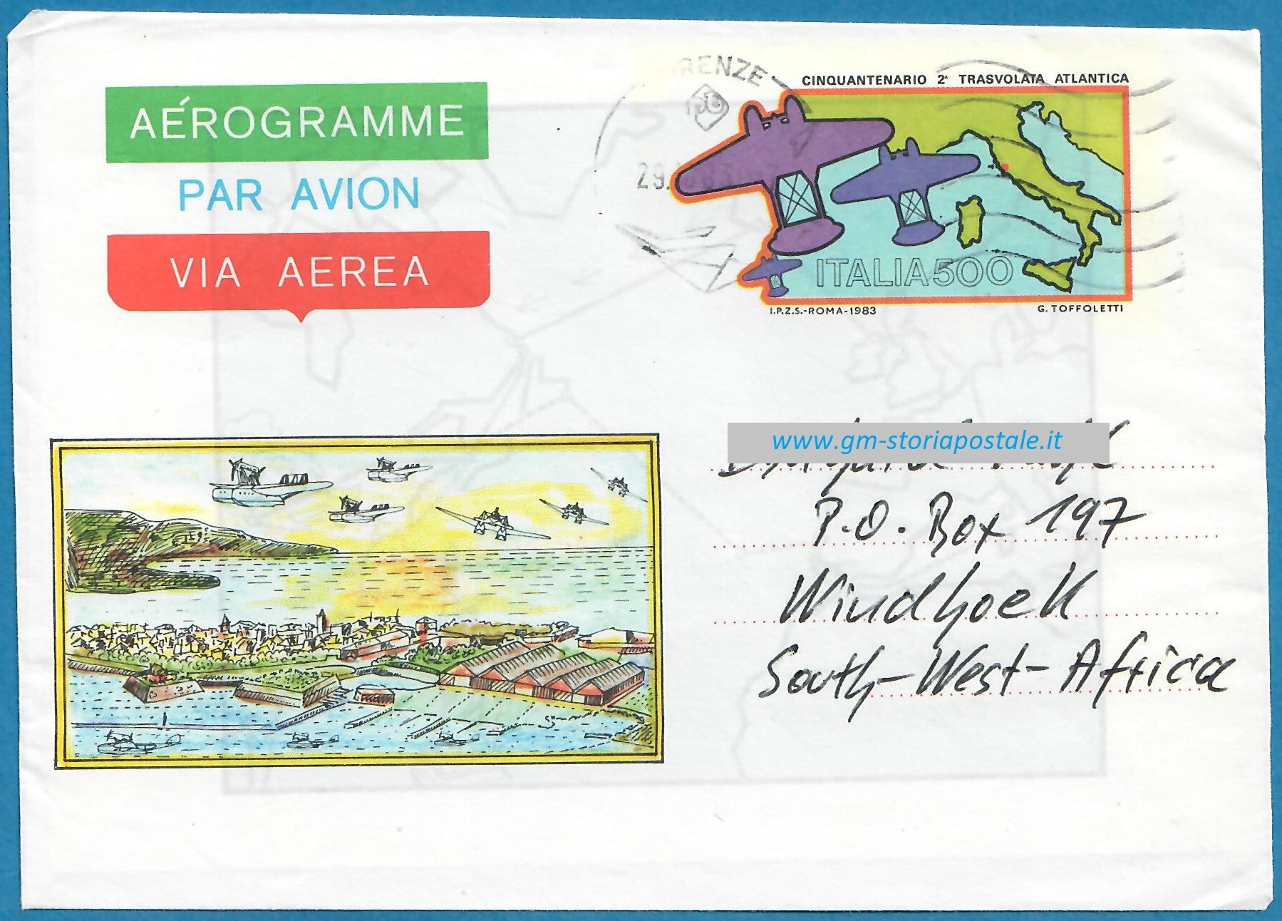 Tra il 1° gennaio 1983 ed il 31 dicembre 1983 la tariffa per affrancare un aerogramma era di 500 lire. L’esemplare sotto riportato fu spedito da Firenze il 29 ottobre 1983 per l’Africa del Sud-Ovest.