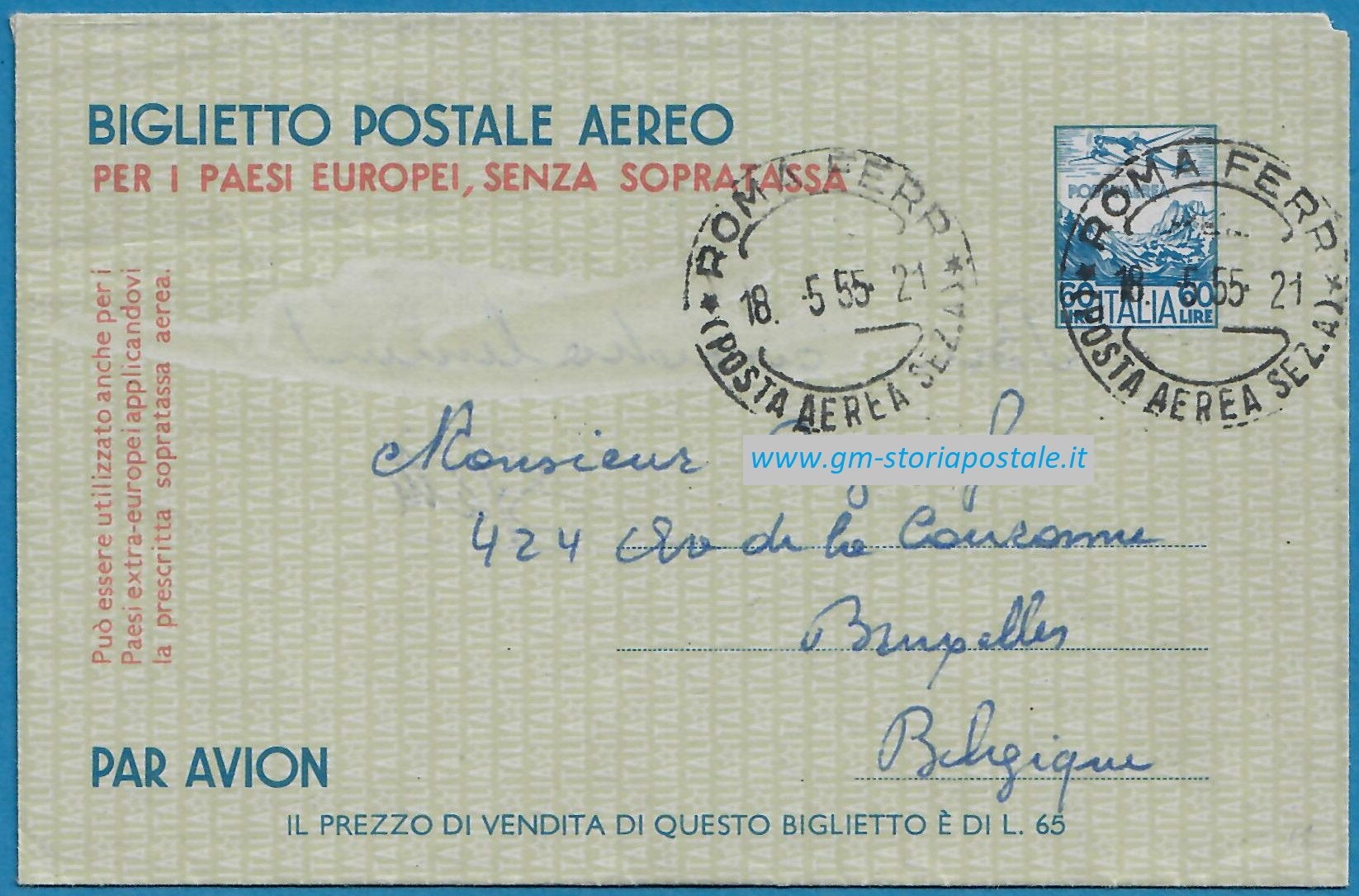 Tra la data di emissione ed il 30 giugno 1960 la tariffa per affrancare l’aerogramma era di 60 lire. L’esemplare sotto riportato fu spedito da Roma il 18 maggio 1955 per il Belgio.