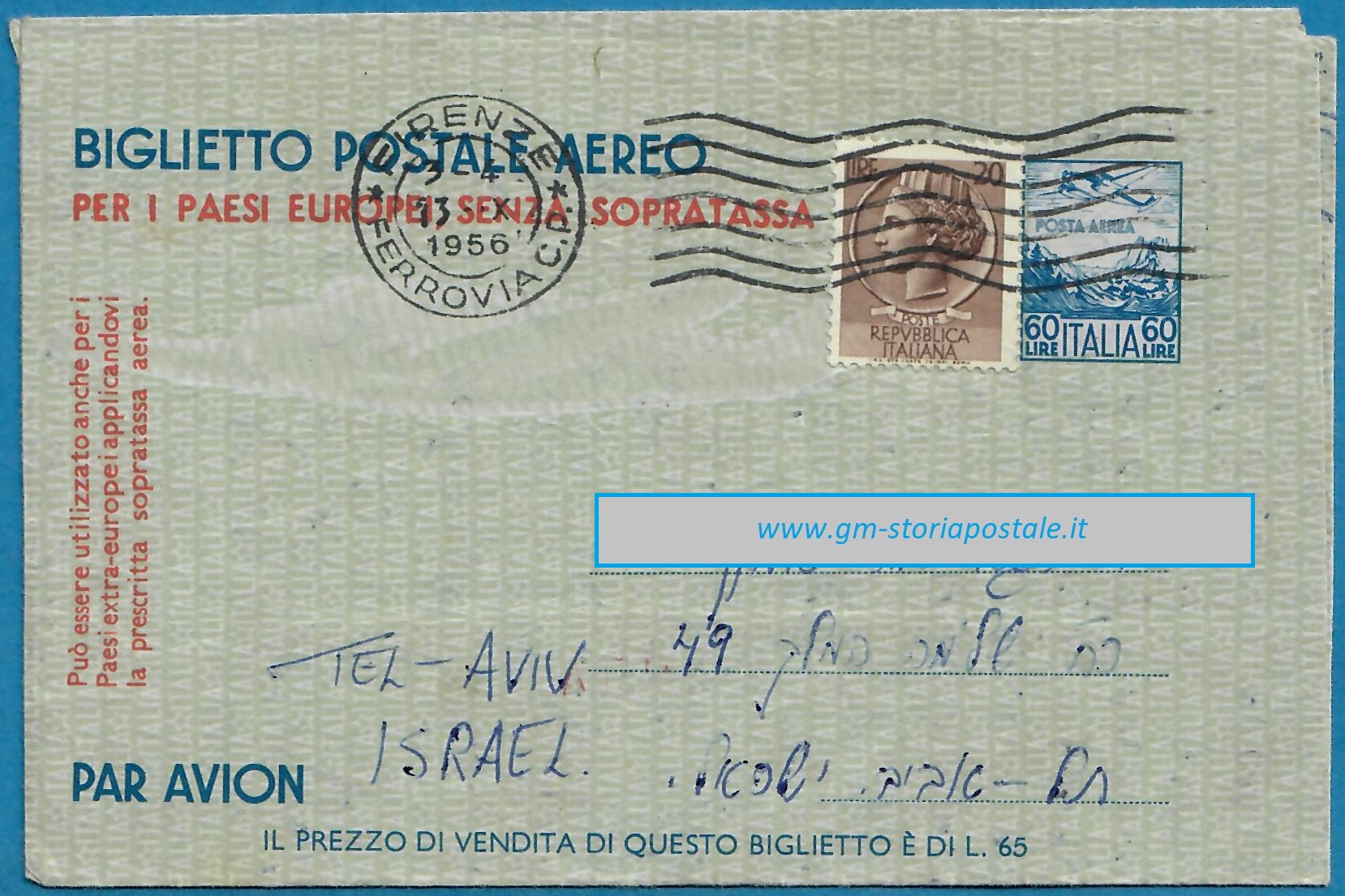 Tra il 26 gennaio 1953 ed il 24 marzo 1975 la soprattassa per la Posta Aerea diretta in Israele era di 20 lire: pertanto nell’aerogramma per Israele sotto riportato, spedito da Firenze il 13 ottobre 1956, fu necessaria un’integrazione di 20 lire.