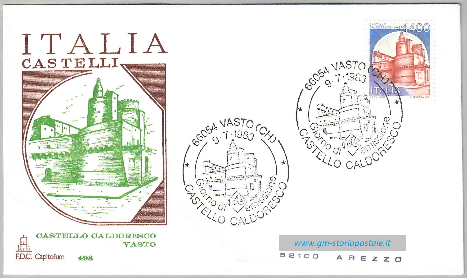 Il francobollo da 1400 lire della serie Castelli d’Italia, raffigurante il Castello Caldoresco di Vasto, fu emesso il 9 luglio 1983 con validità permanente. L’annullo speciale per il primo giorno di emissione fu in uso a Vasto.