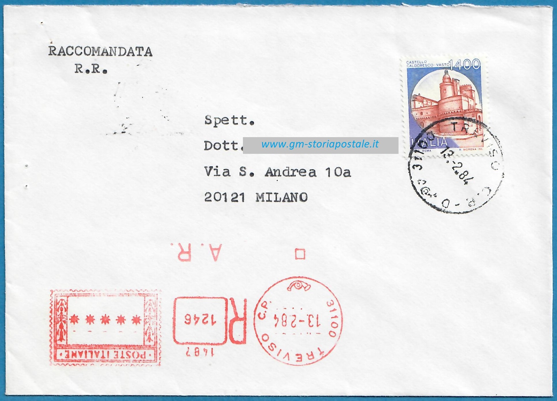 Tra il 1° febbraio 1983 ed il 31 maggio 1984 la tariffa per affrancare una lettera primo porto per l’interno era di 400 lire, mentre nello stesso periodo la soprattassa per la raccomandazione ammontava a 1000 lire: la lettera primo porto raccomandata, pertanto, si affrancava con 1400 lire. L’esemplare sotto riportato fu spedito da Treviso il 13 febbraio 1984 per Milano.