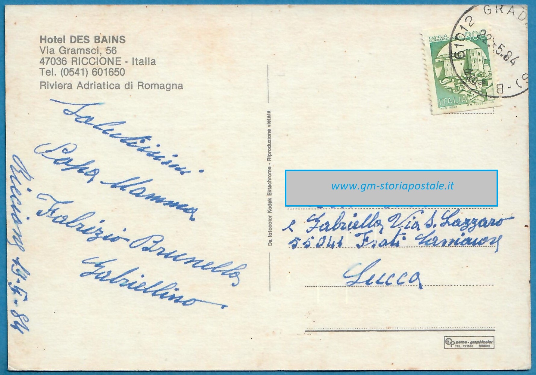Tra il 1° febbraio 1983 ed il 31 maggio 1984 la tariffa per affrancare una cartolina era di 300 lire. L’esemplare sotto riportato fu spedito da Grado il 22 maggio 1984 per Lucca.