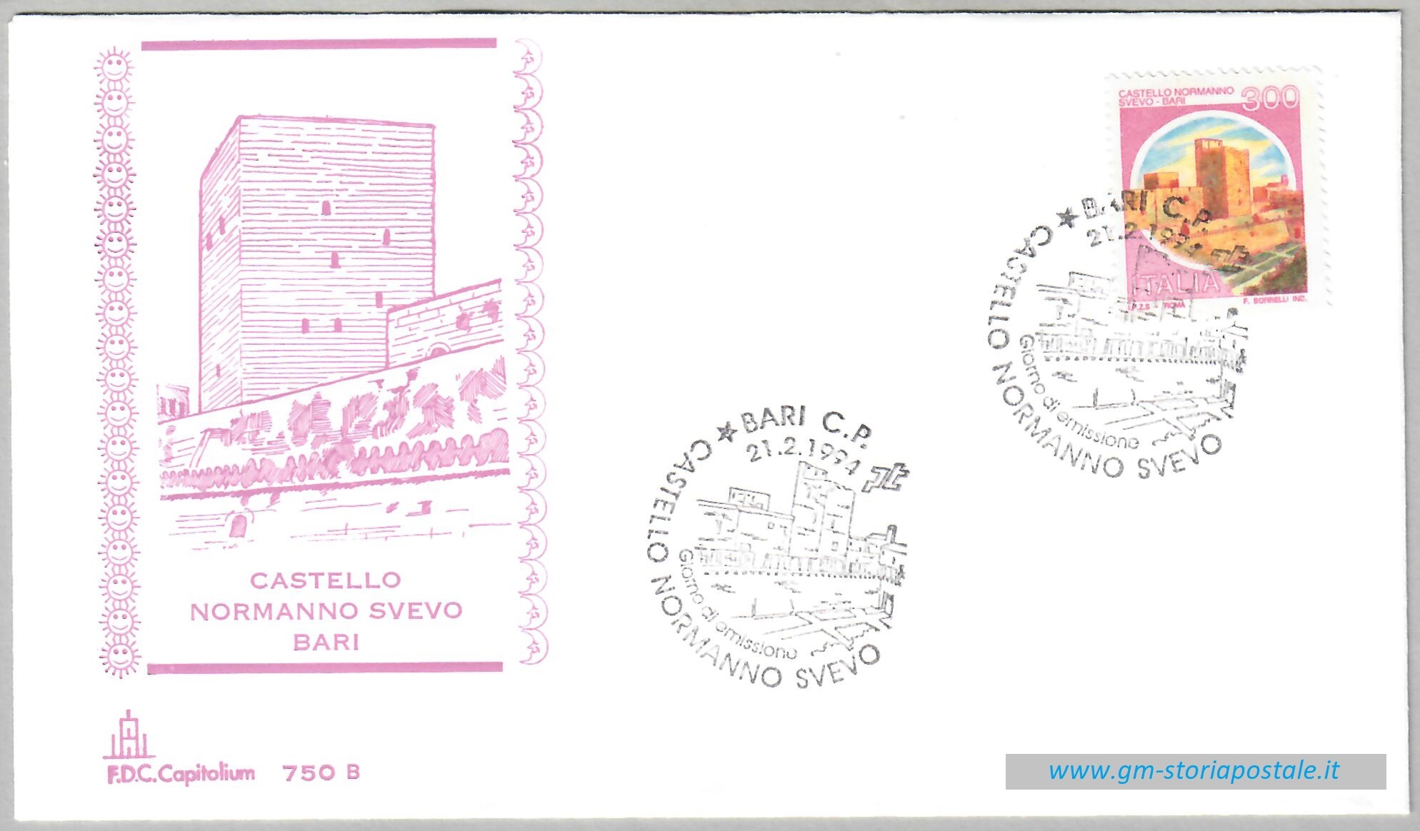 Il francobollo da 300 lire della serie Castelli d’Italia, raffigurante il Castello Normanno Svevo di Bari, fu riemesso con stampa in rotocalco il 21 febbraio 1994 con validità permanente. Il francobollo dell’emissione del 1980, stampato con la più raffinata tecnologia della calcografia ed offset, è presentato in questa pagina. In occasione della riemissione del francobollo fu in uso un annullo speciale a Bari, come in occasione dell’emissione del 1980. Non si tratta però del riutilizzo dello stesso timbro del 1980, in quanto la grafica di quello usato nel 1994 è leggermente differente.