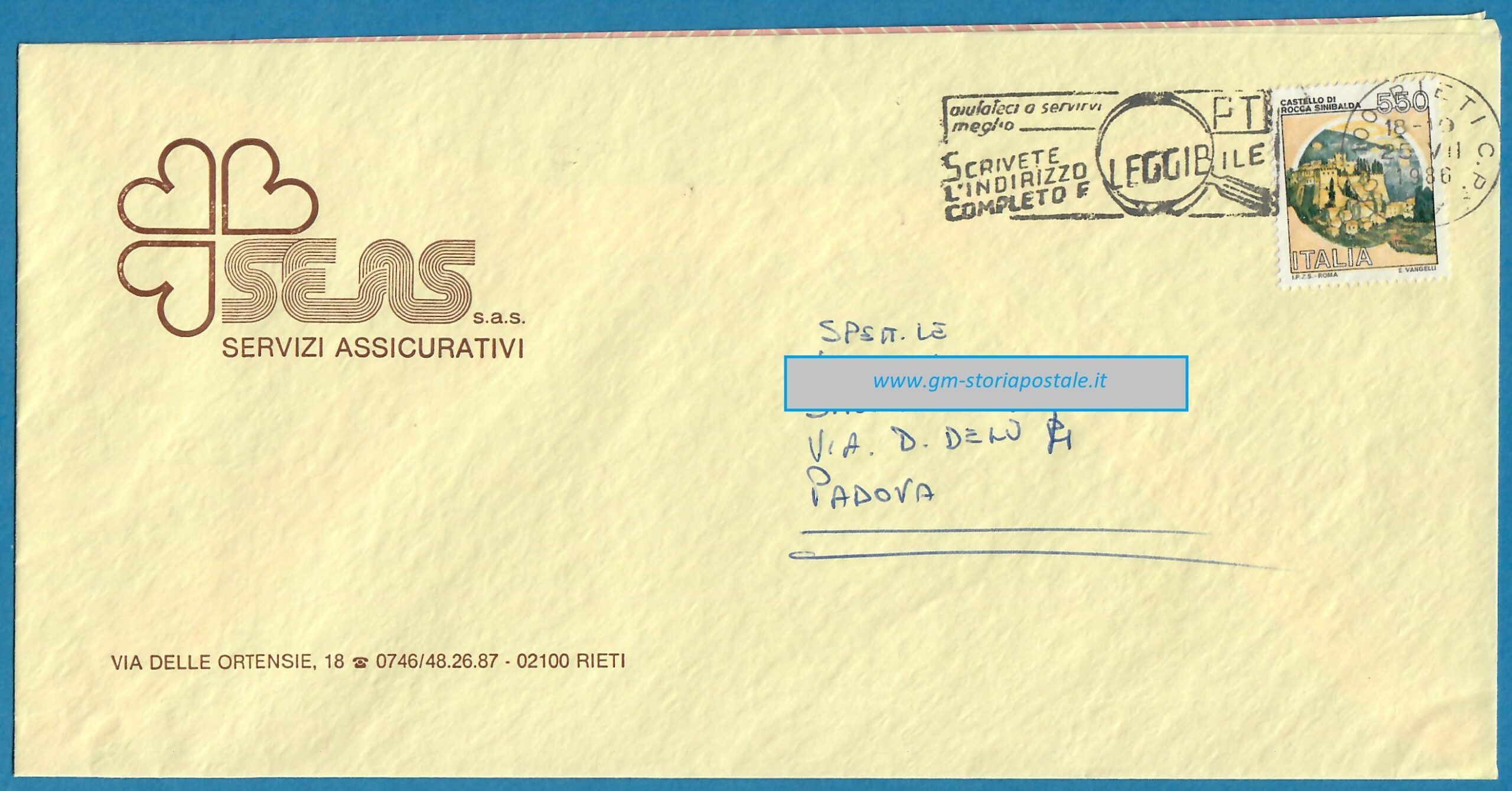 Tra il 13 novembre 1985 ed il 15 novembre 1986 la tariffa per affrancare una lettera primo porto per l’interno era di 550 lire. L’esemplare sotto riportato fu spedito da Rieti (annullo con targhetta) il 25 luglio 1986 per Padova.