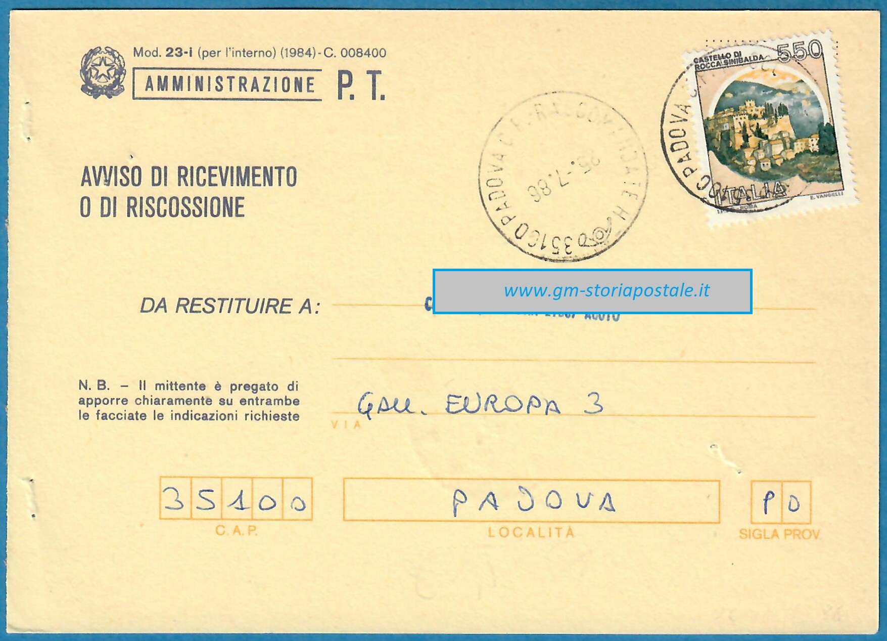Tra il 13 novembre 1985 ed il 15 novembre 1986 anche la tariffa per affrancare un avviso di ricevimento era di 550 lire. L’esemplare sotto riportato fu spedito da Padova il 25 luglio 1986 in accompagnamento ad una raccomandata diretta in città e recapitata il giorno successivo.