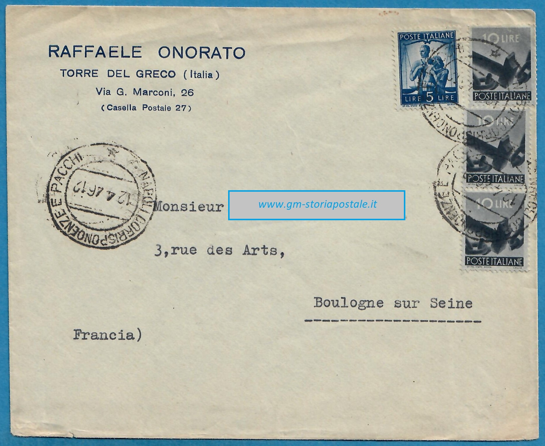 I porti successivi al primo si affrancavano con ulteriori 10 lire ogni ulteriori 20 grammi: la lettera terzo porto per l’estero si affrancava quindi con 15 + 10 + 10 = 35 lire. L’esemplare sotto riportato fu spedito da Napoli il 12 aprile 1946 per la Francia.