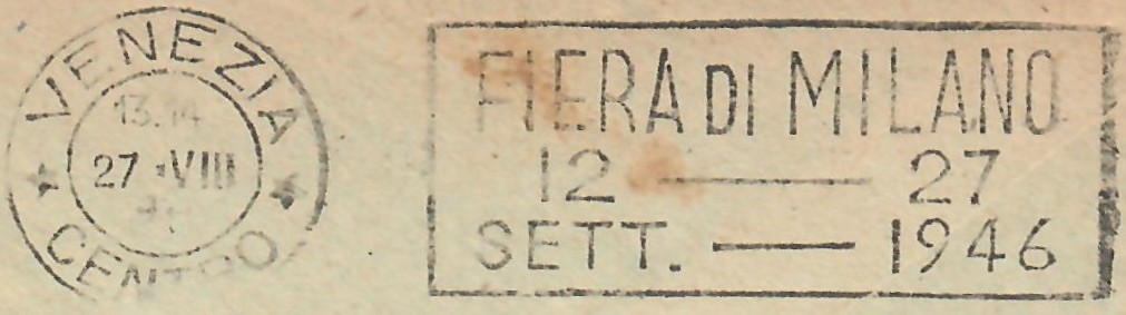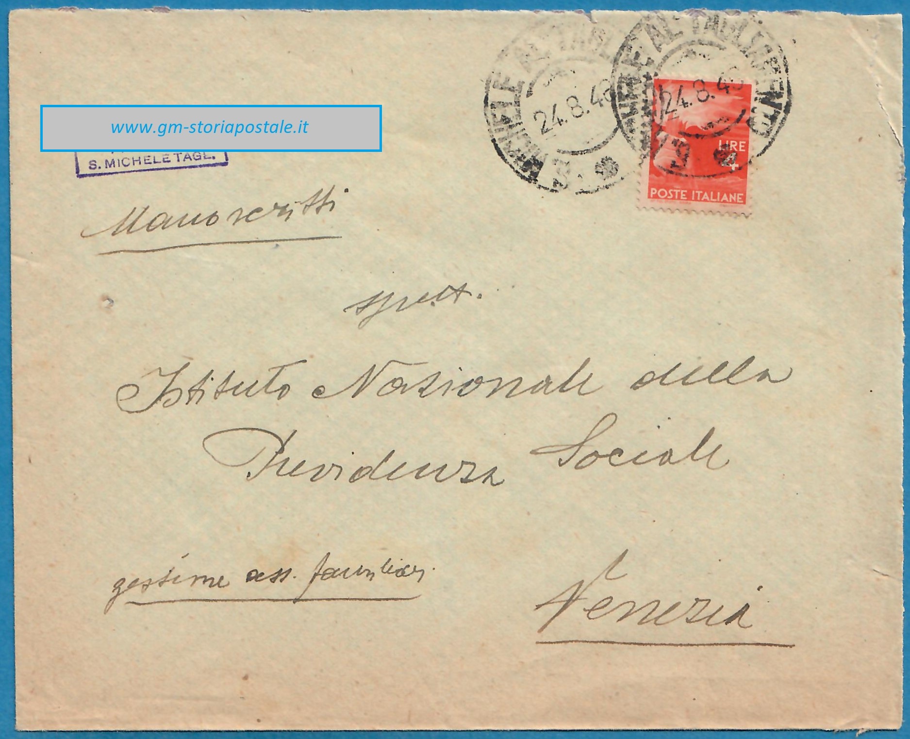 San Michele al Tagliamento, 24 agosto 1946 per Venezia, con targhetta in arrivo il 27 agosto: