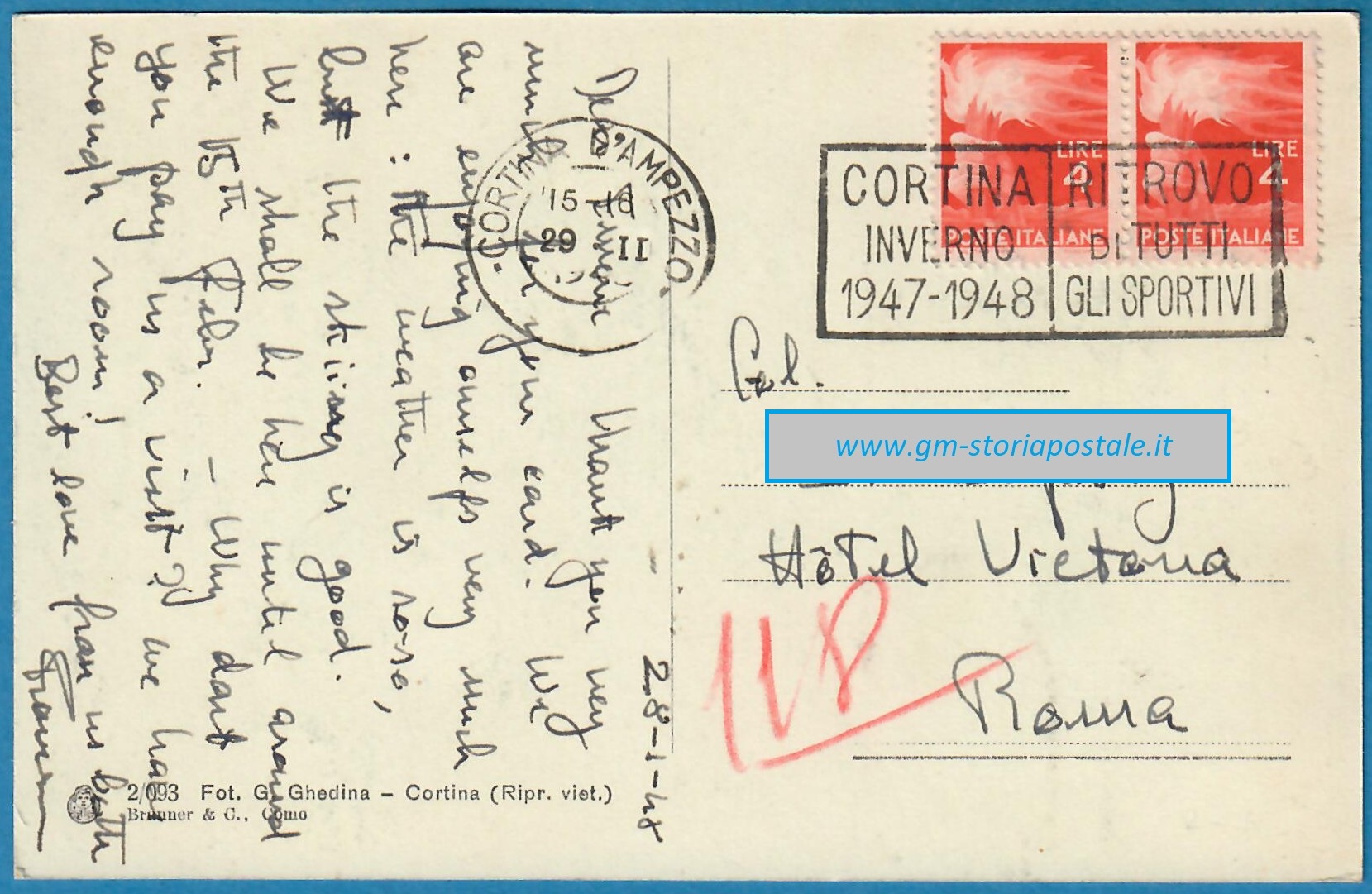 In questa sottopagina sono riportati esemplari di cartoline affrancate con una coppia del 4 lire Democratica annullata con una targhetta.