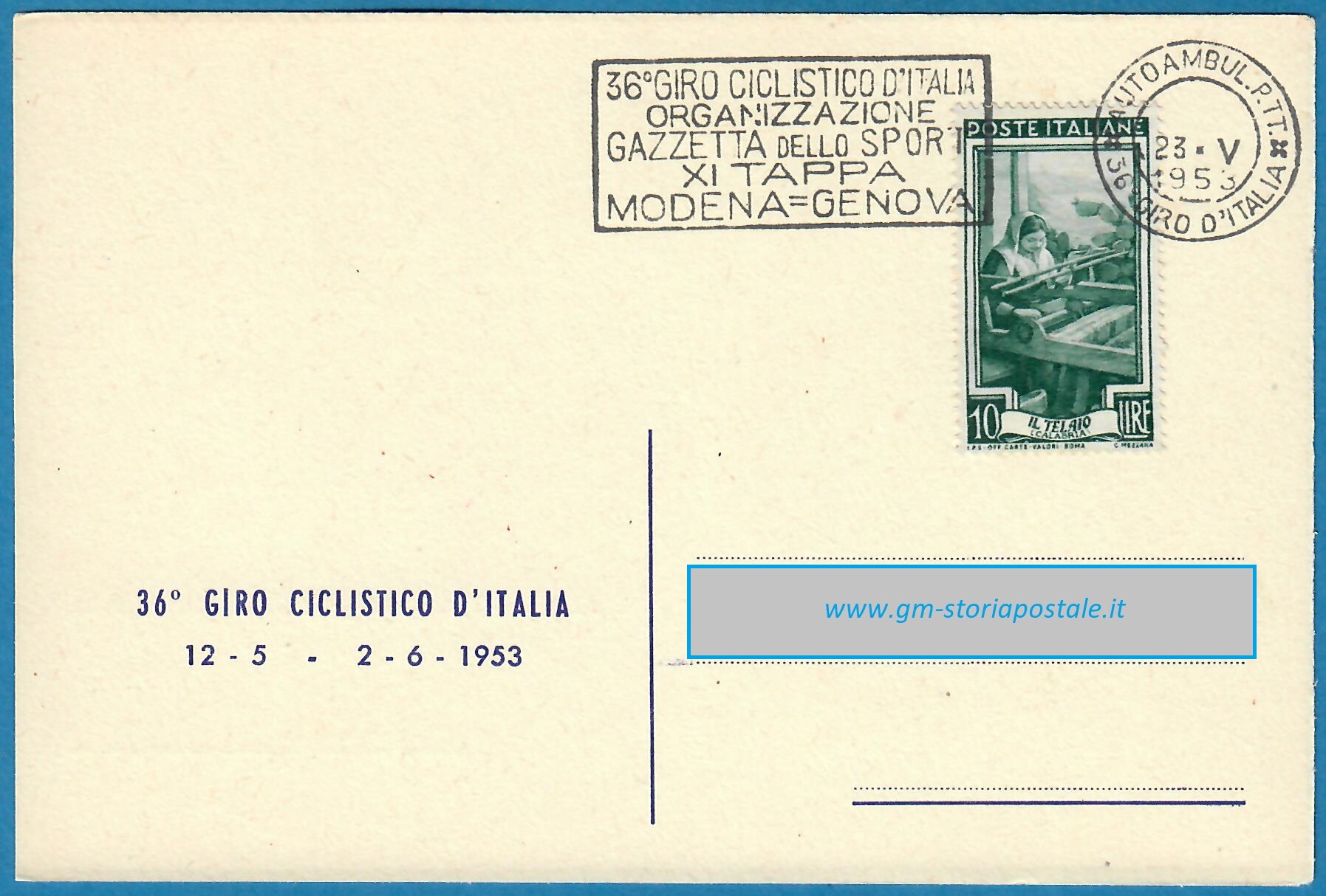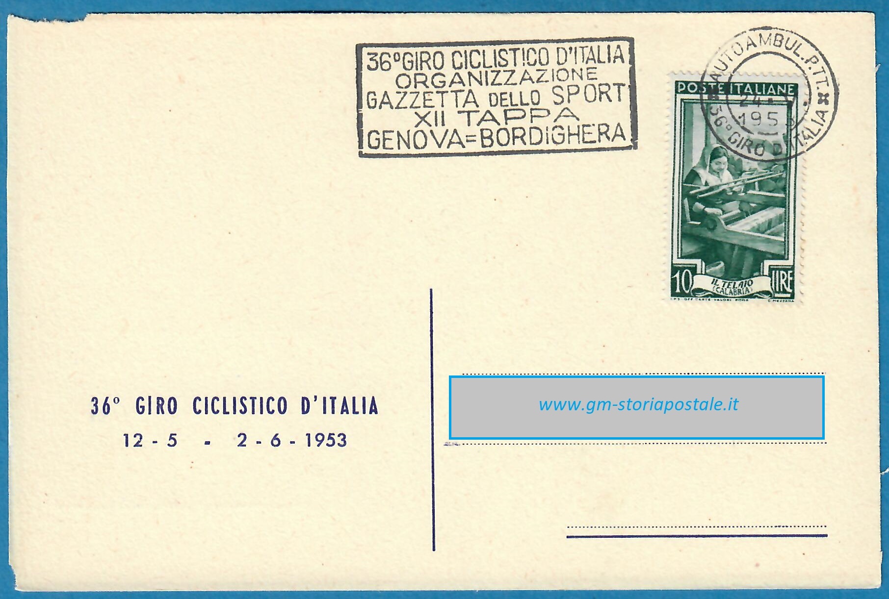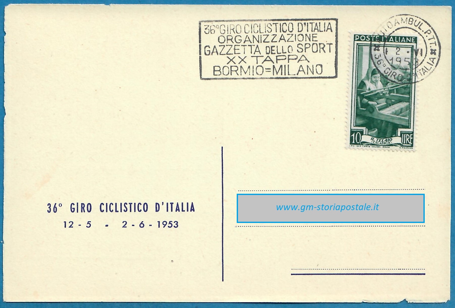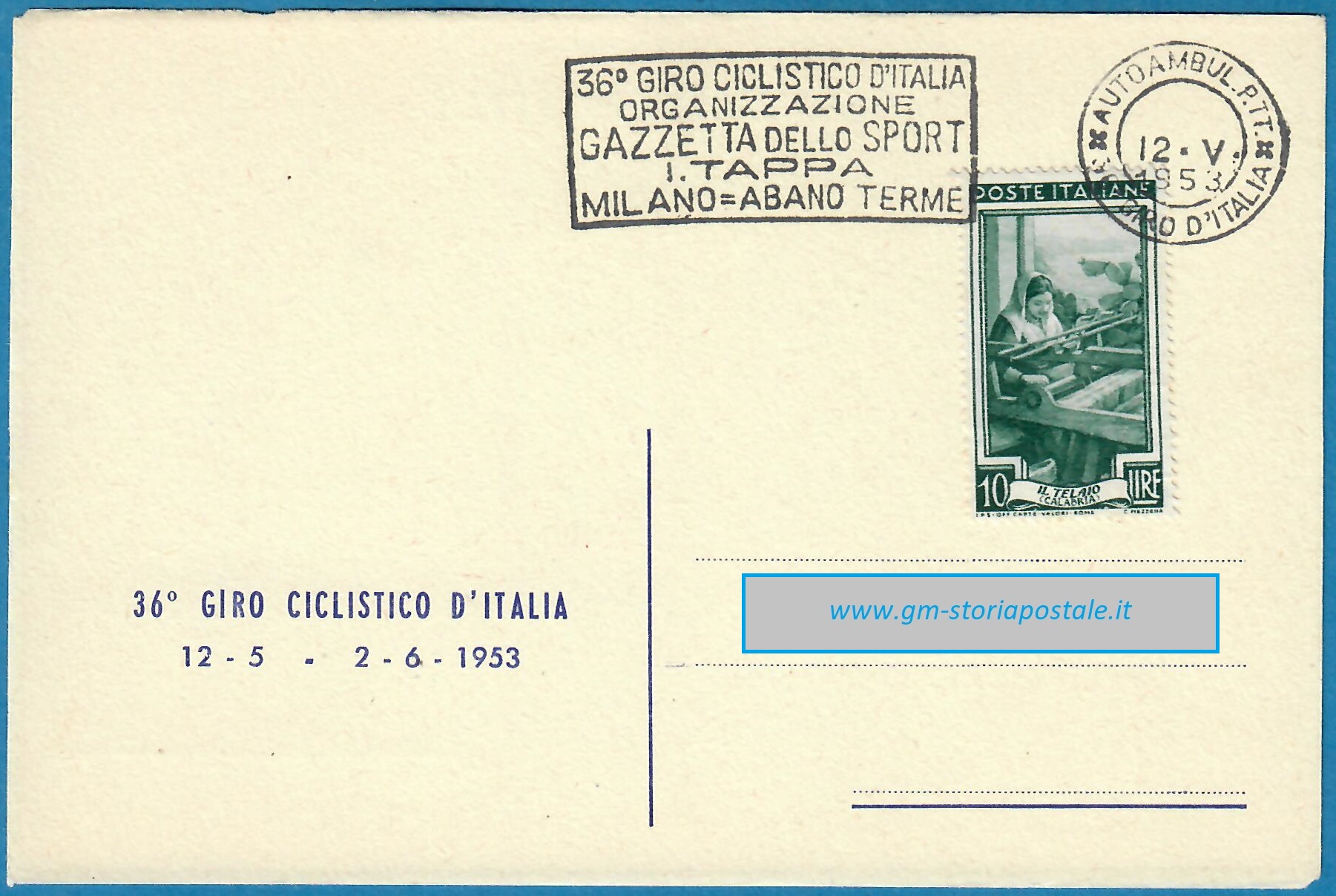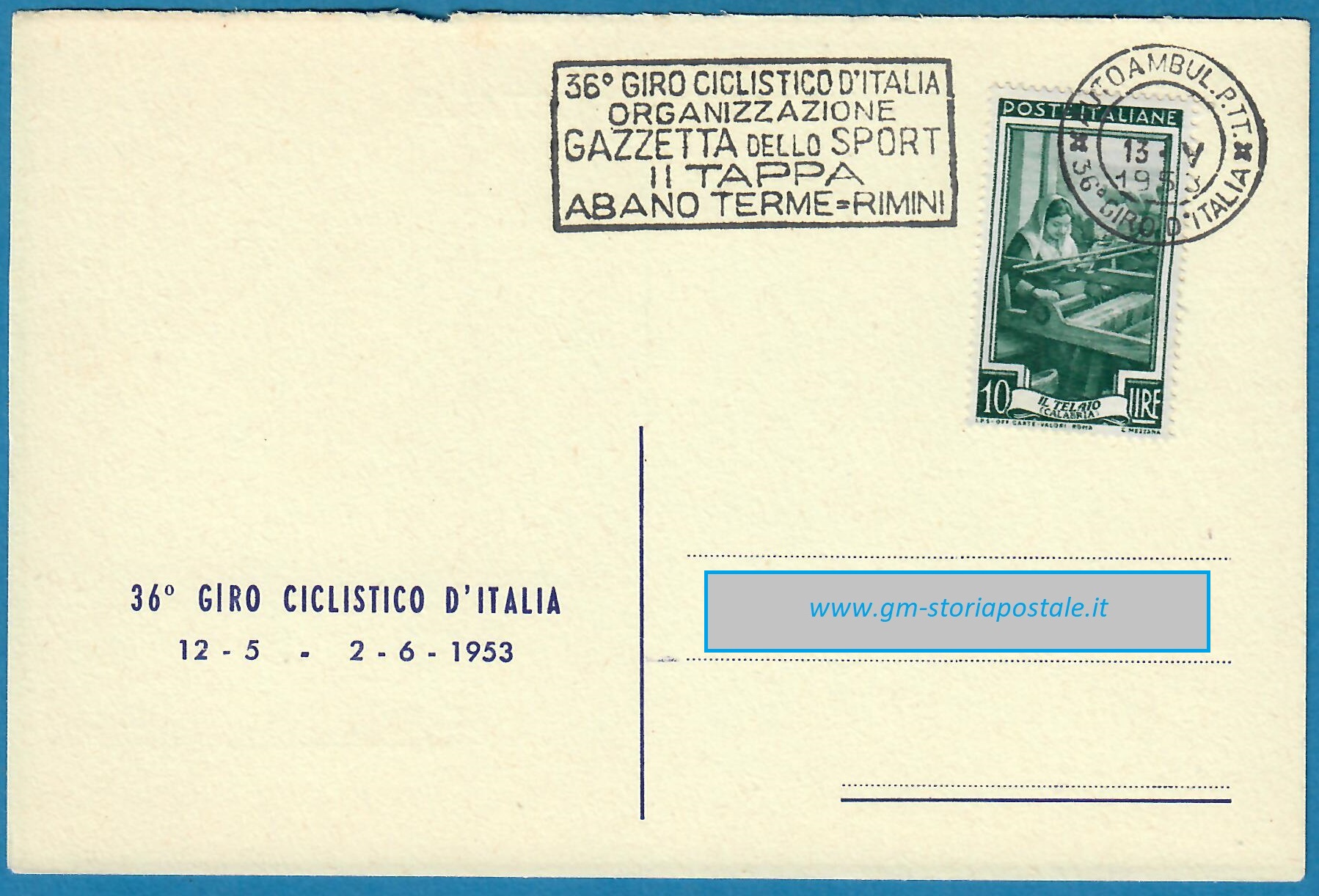 In questa pagina si riporta una serie di cartoline affrancate con il 10 lire Italia al Lavoro e circolate in corso particolare, con il giro completo delle targhette che sono state prodotte per il 36° Giro d’Italia che ha avuto luogo dal 12 maggio al 2 giugno 1954. La corsa è stata seguita da un Ufficio Postale Autoambulante che ha utilizzato in occasione di ogni tappa una targhetta diversa.
