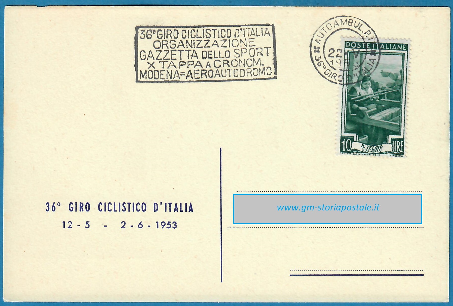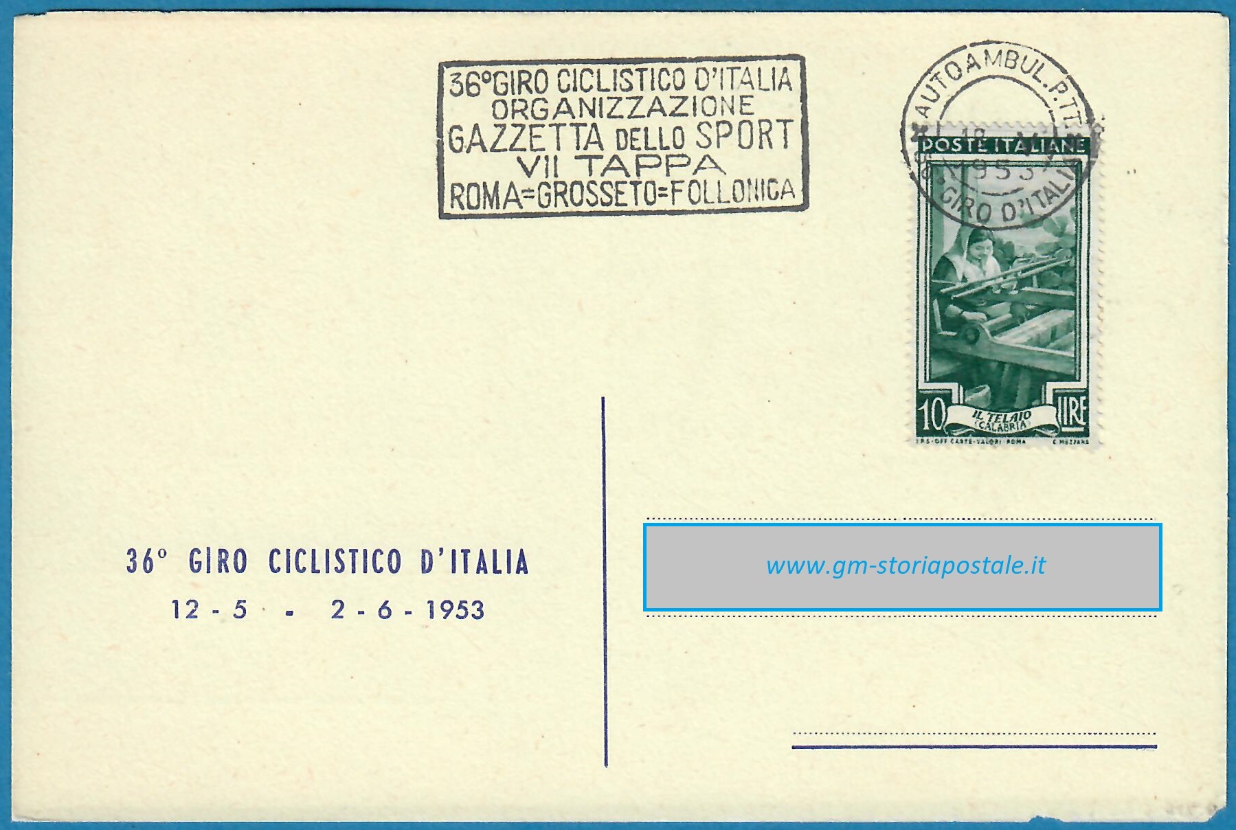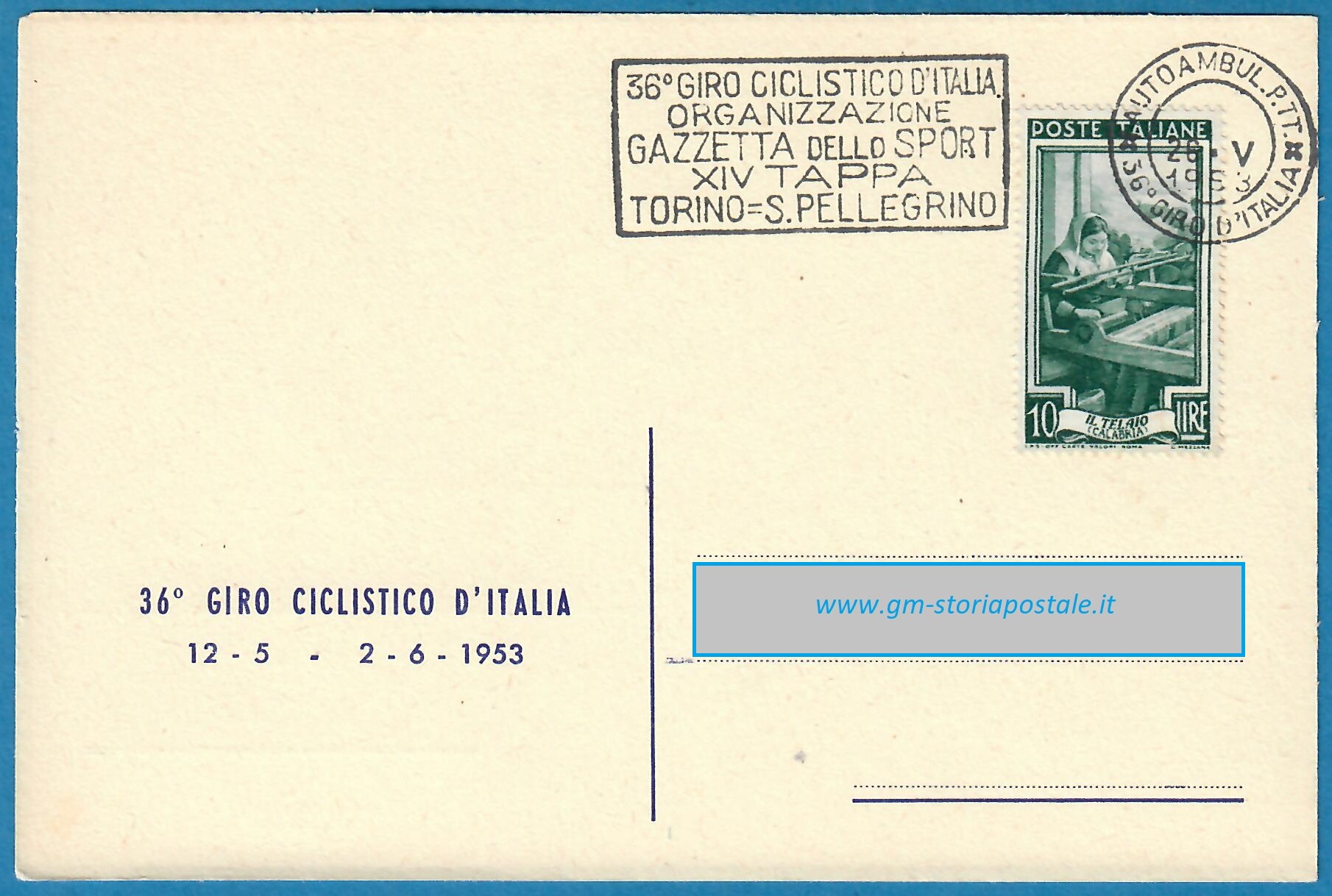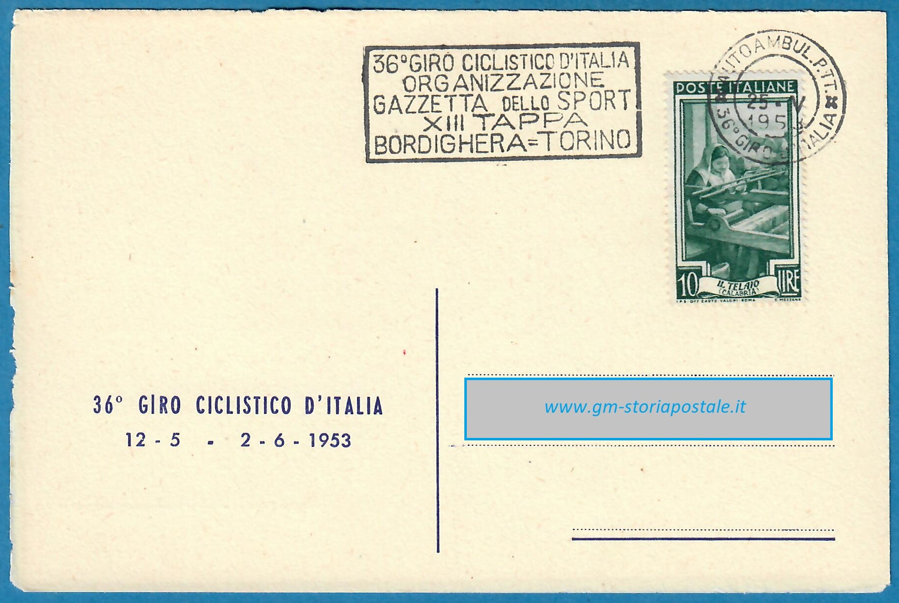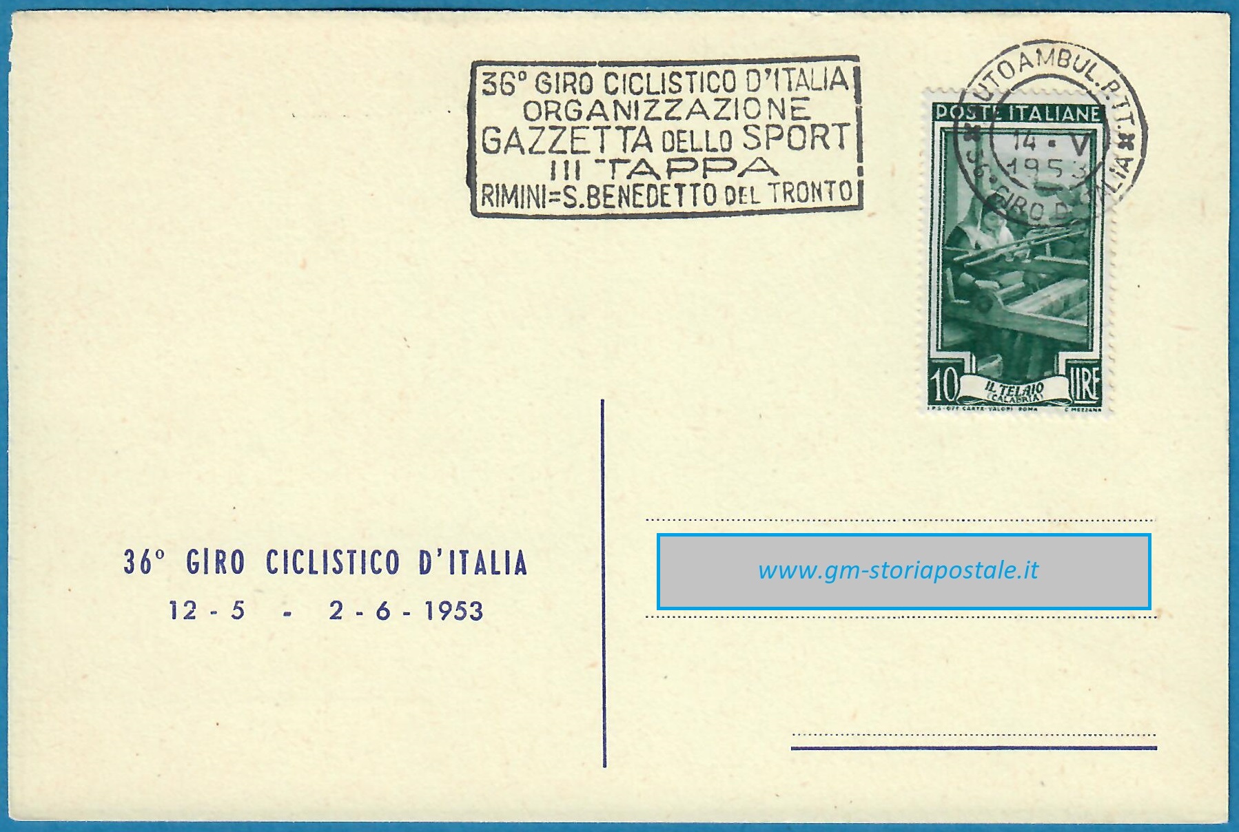 In questa pagina si riporta una serie di cartoline affrancate con il 10 lire Italia al Lavoro e circolate in corso particolare, con il giro completo delle targhette che sono state prodotte per il 36° Giro d’Italia che ha avuto luogo dal 12 maggio al 2 giugno 1954. La corsa è stata seguita da un Ufficio Postale Autoambulante che ha utilizzato in occasione di ogni tappa una targhetta diversa.