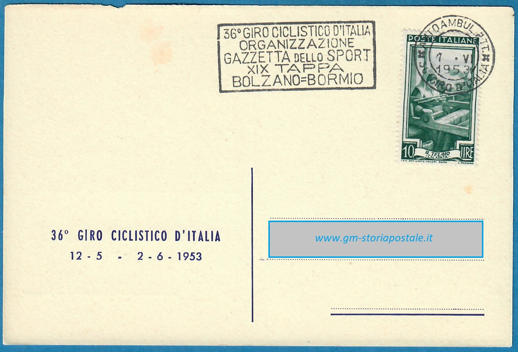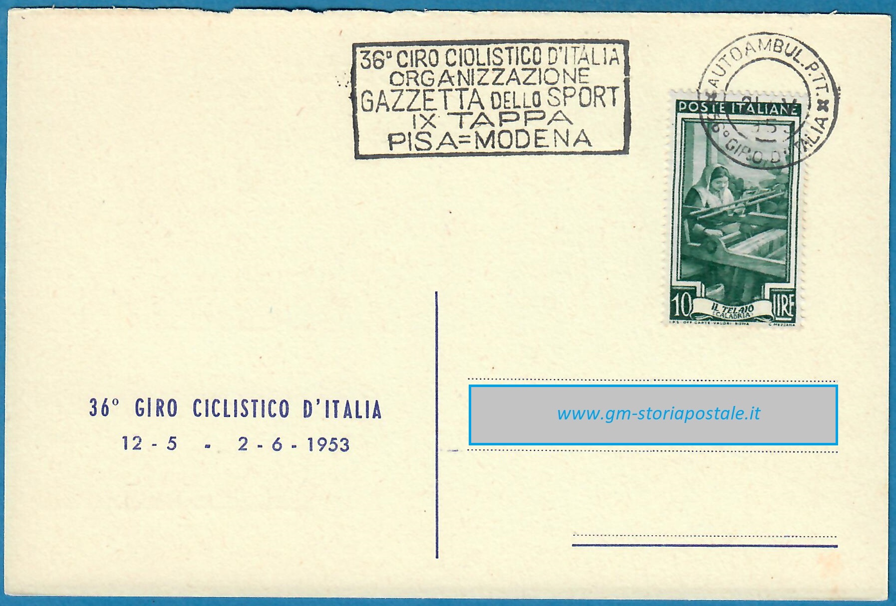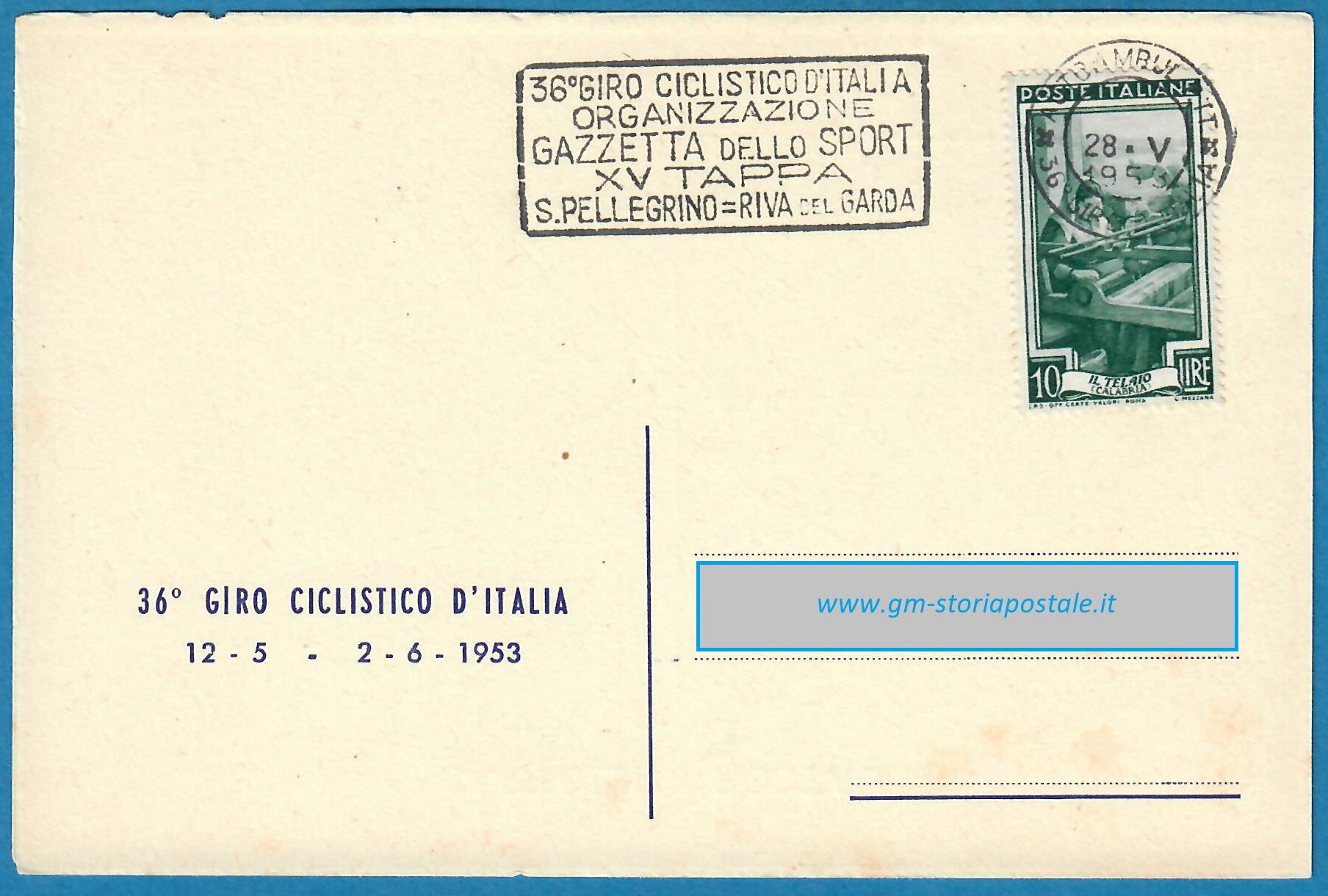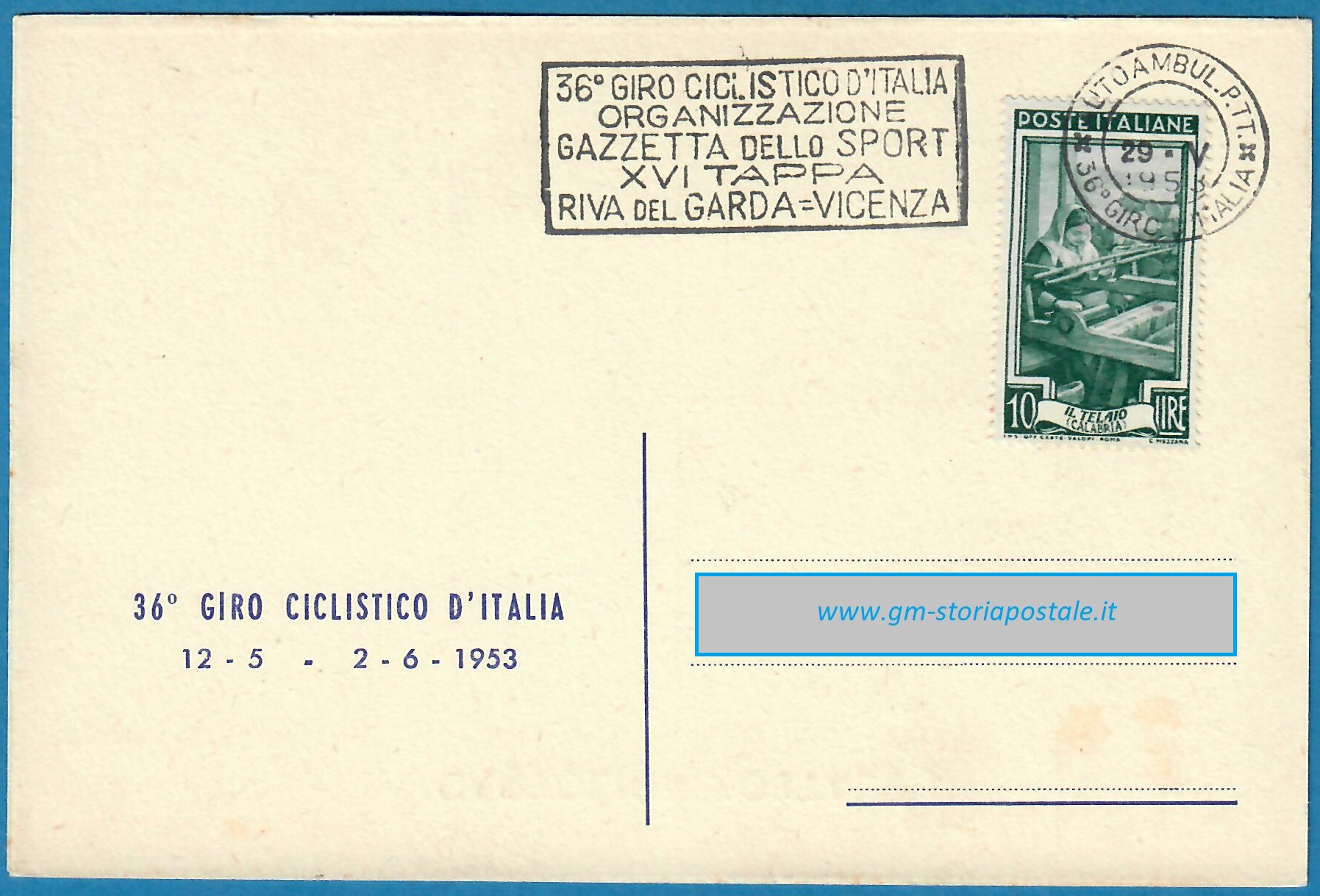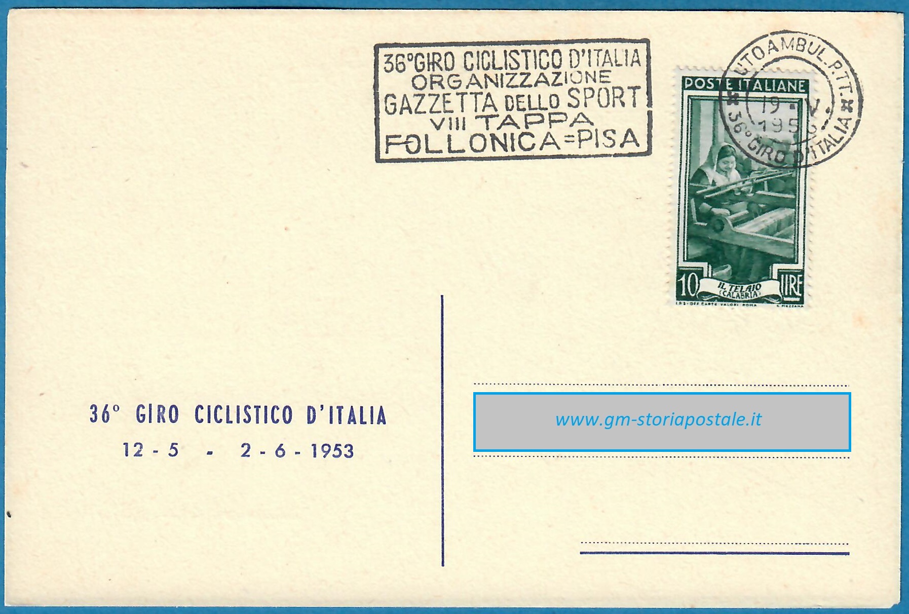 In questa pagina si riporta una serie di cartoline affrancate con il 10 lire Italia al Lavoro e circolate in corso particolare, con il giro completo delle targhette che sono state prodotte per il 36° Giro d’Italia che ha avuto luogo dal 12 maggio al 2 giugno 1954. La corsa è stata seguita da un Ufficio Postale Autoambulante che ha utilizzato in occasione di ogni tappa una targhetta diversa.