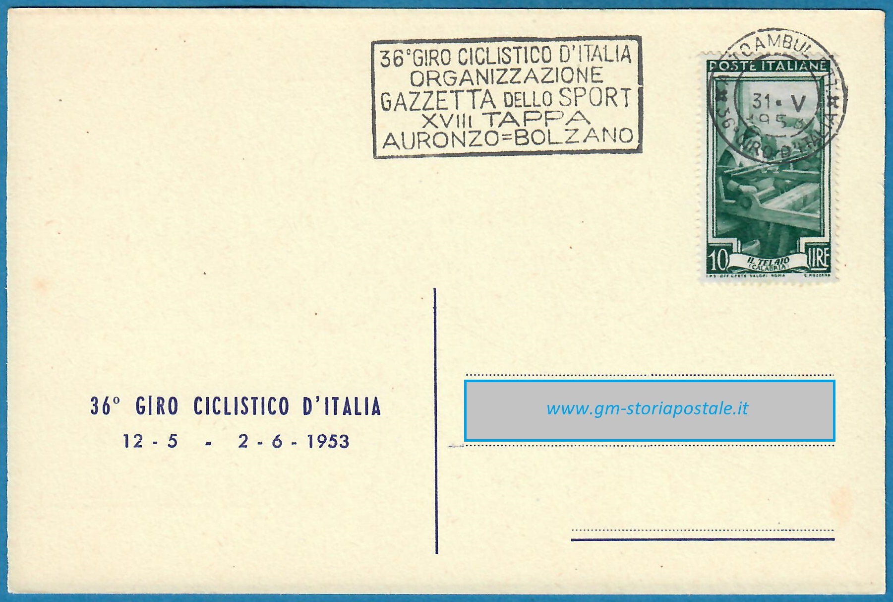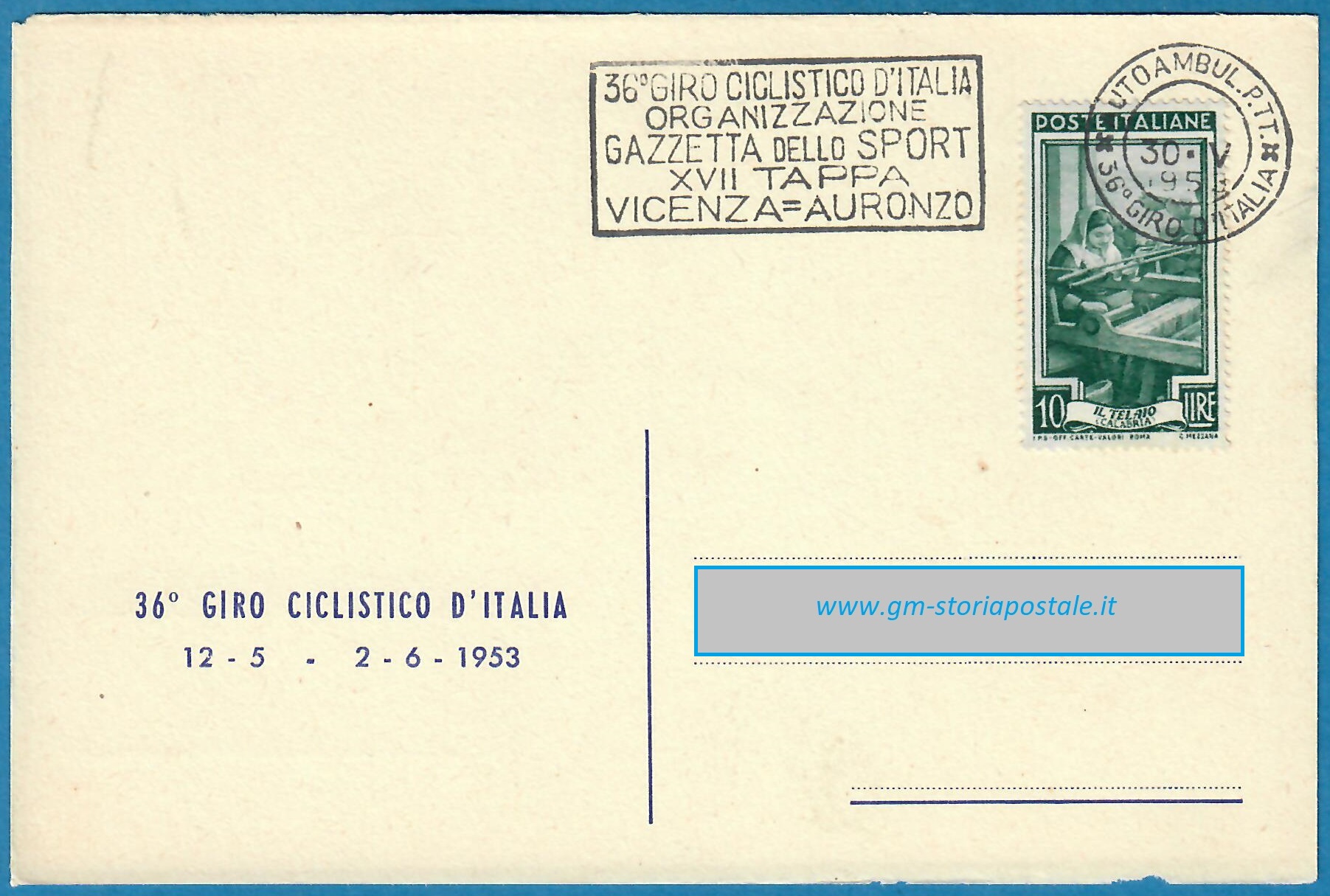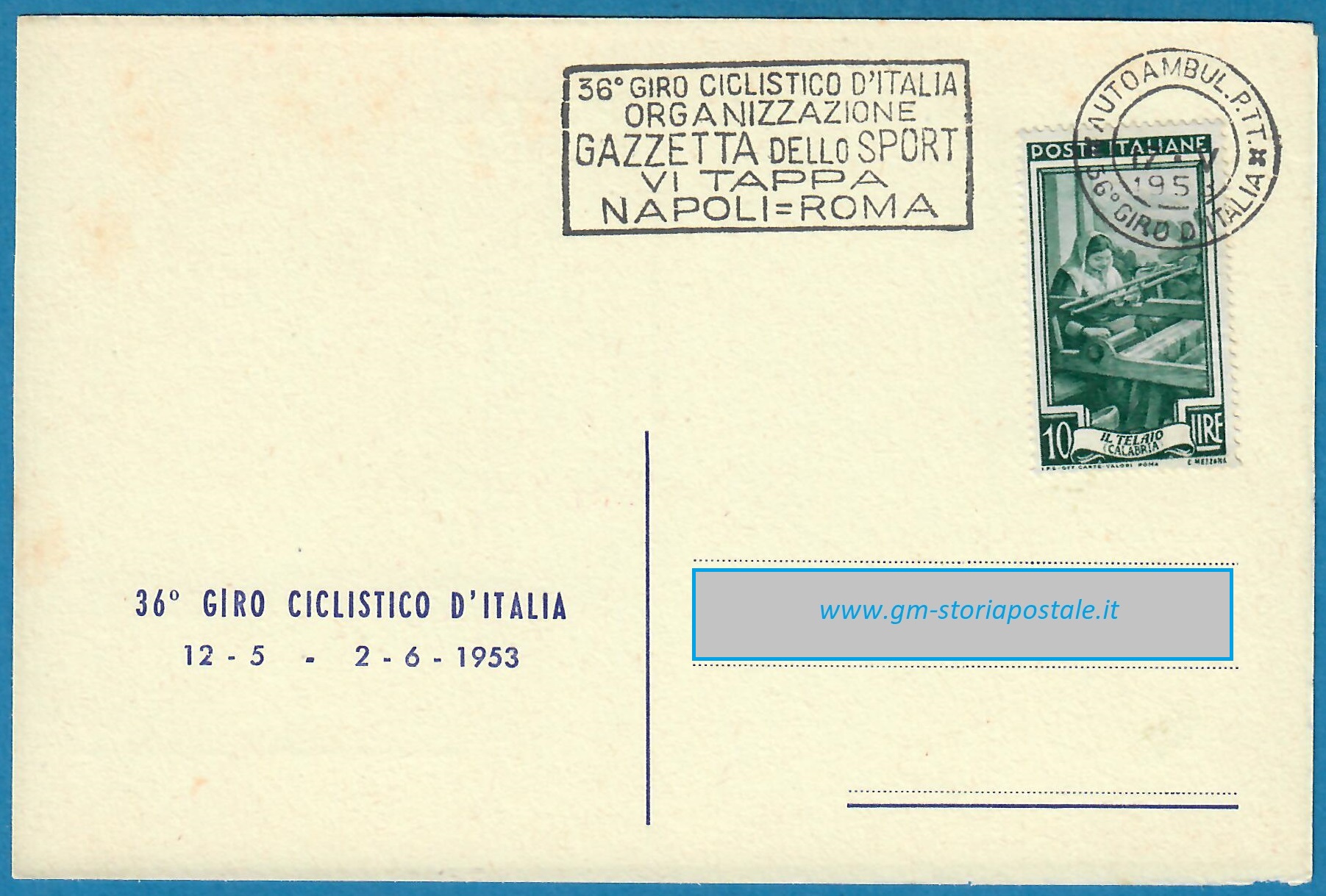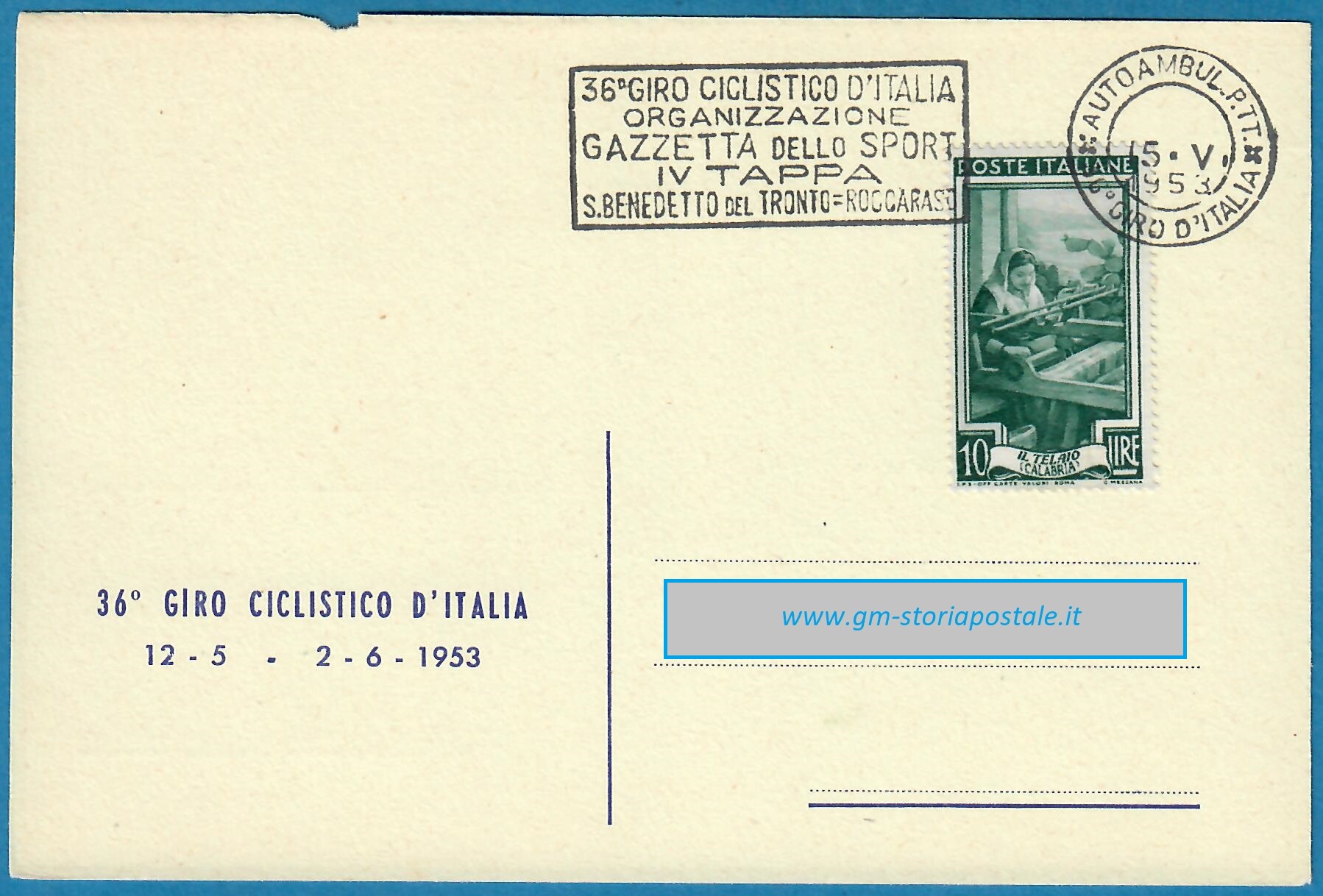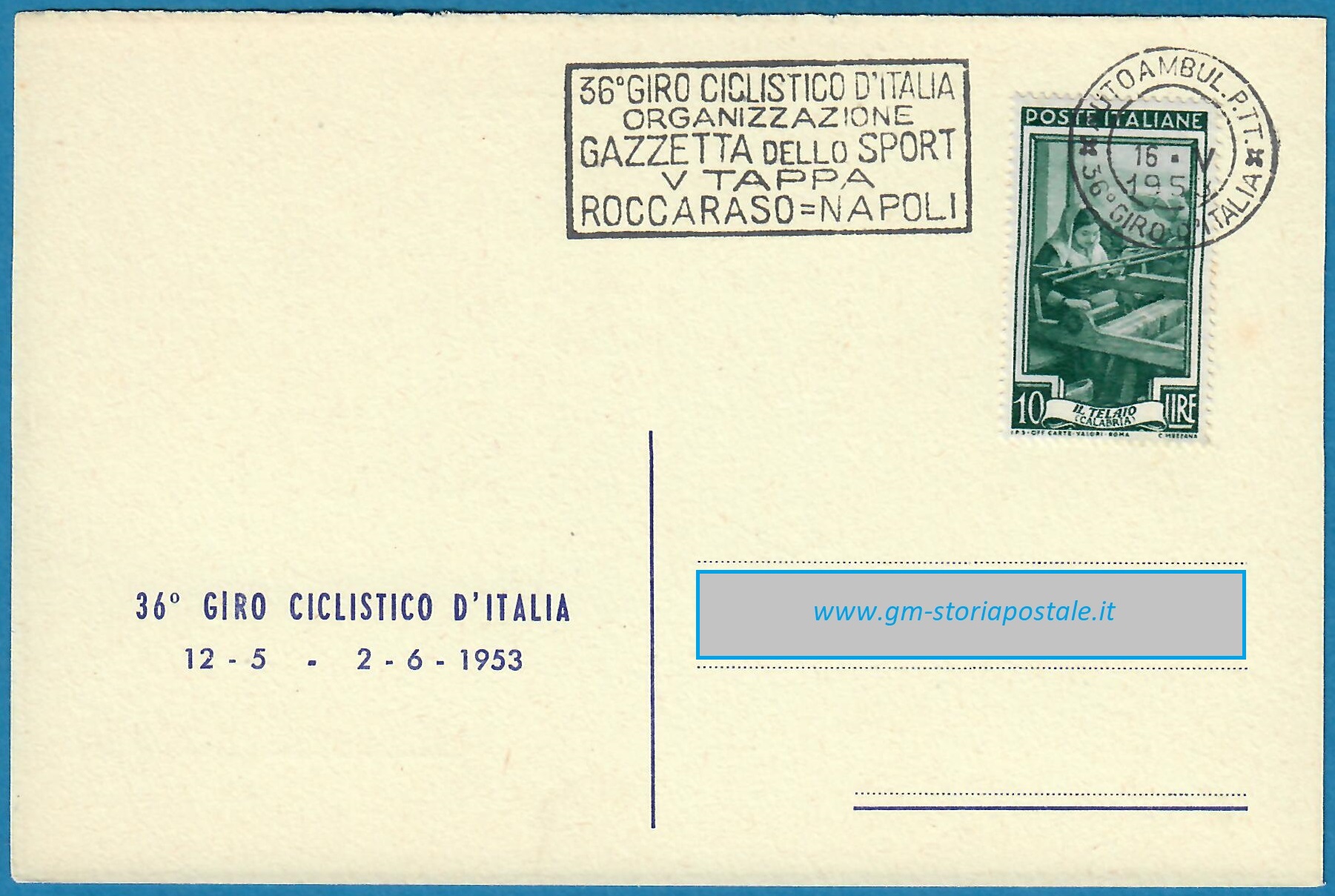 In questa pagina si riporta una serie di cartoline affrancate con il 10 lire Italia al Lavoro e circolate in corso particolare, con il giro completo delle targhette che sono state prodotte per il 36° Giro d’Italia che ha avuto luogo dal 12 maggio al 2 giugno 1954. La corsa è stata seguita da un Ufficio Postale Autoambulante che ha utilizzato in occasione di ogni tappa una targhetta diversa.