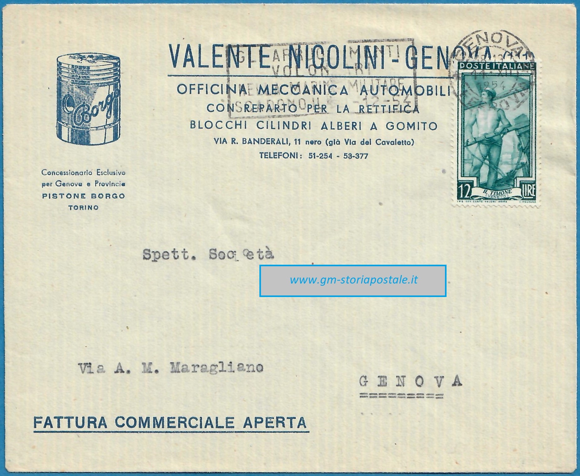 Tra l’11 agosto 1948 ed il 30 novembre 1955 una fattura commerciale aperta si affrancava con 12 lire. L’esemplare sotto riportato fu spedito da Vicenza (annullo con targhetta) il 28 marzo 1952.