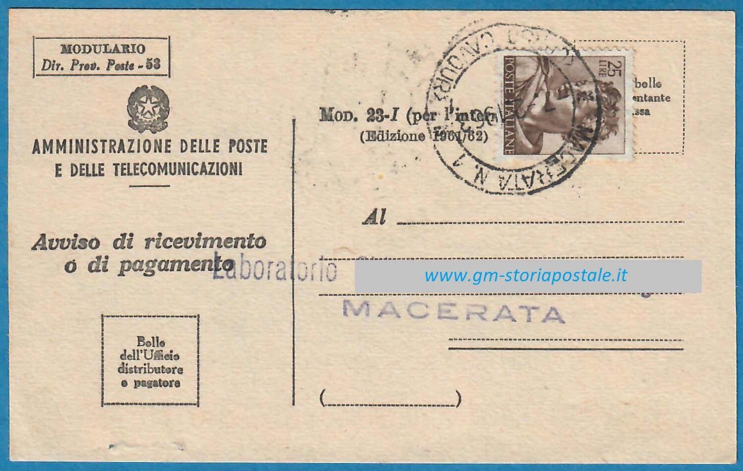 Tra il 1° settembre 1959 ed il 31 luglio 1965 la tariffa per affrancare un avviso di ricevimento era di 25 lire. L’esemplare sotto riportato fu spedito da Macerata il 7 febbraio 1963 in accompagnamento ad una raccomandata diretta nella città, dove fu recapitata il giorno successivo.