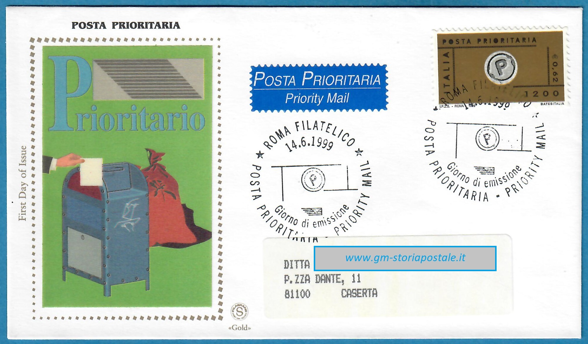 Il primo francobollo per la Posta Prioritaria, del valore di 1200 lire, fu emesso il 14 giugno 1999 con validità permanente. Il bollo speciale per il giorno di emissione fu in uso a Roma.