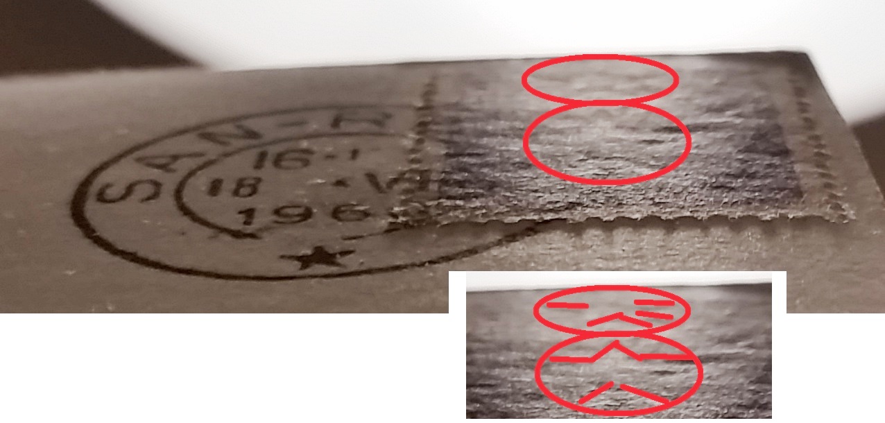 La fotografia sotto riportata, scattata con luce radente e poi modificata per meglio evidenziare la filigrana, mostra una stella disposta con punta verso l’alto al centro del francobollo ed una seconda stella posta al di sopra della prima, verso il margine superiore.