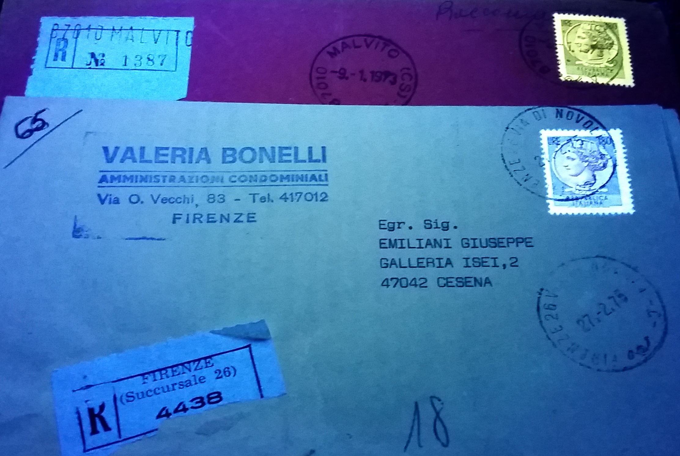 E’ possibile vedere all’ultravioletto che la busta del 1973 è affrancata con il francobollo che presenta fluorescenza giallastra (catalogo CEI 1099A) mentre la busta del 1975 è affrancata con il valore più recente che presenta fluorescenza bianco candida (catalogo CEI 1099AI).