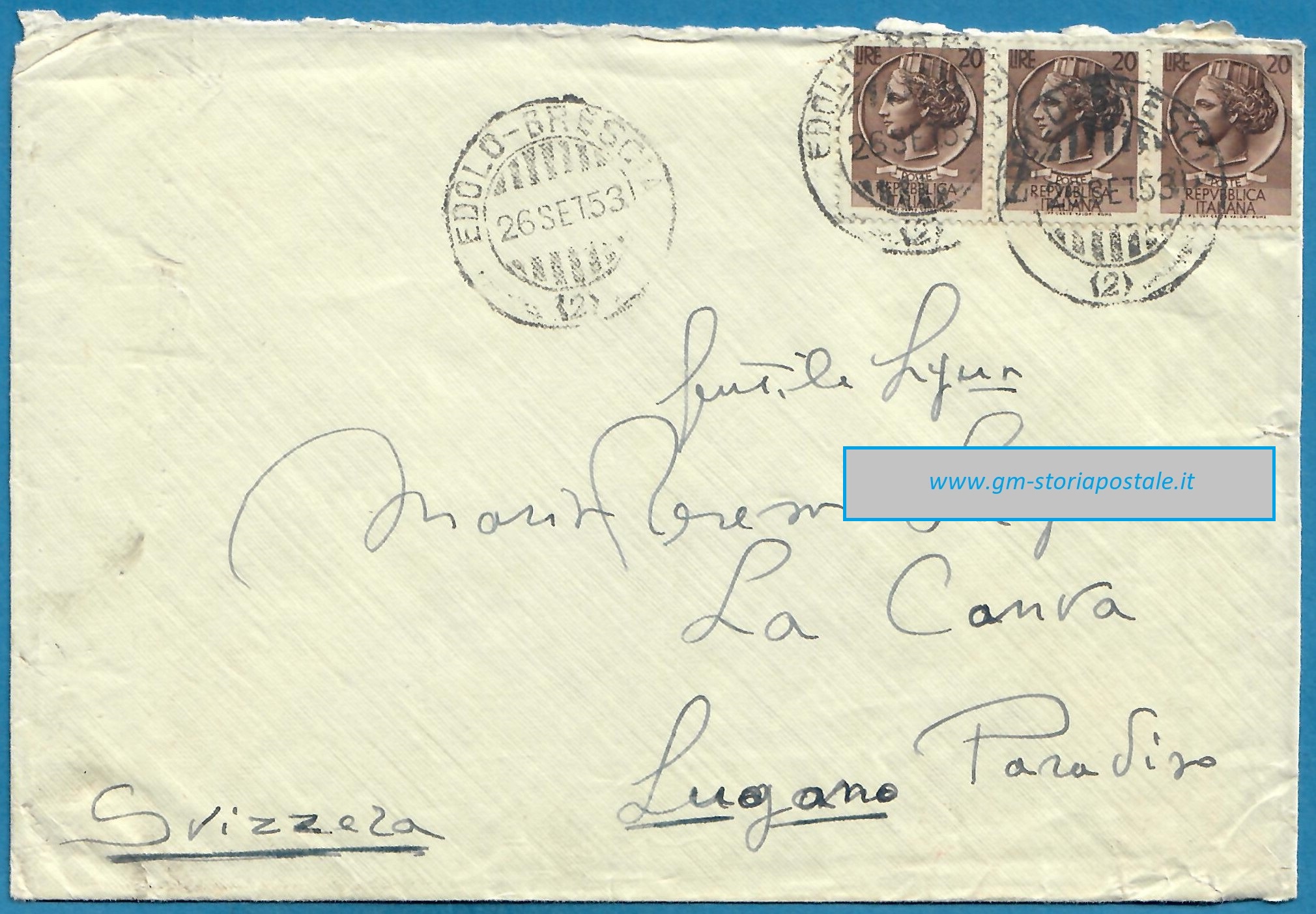 Tra il 1° settembre 1951 ed il 30 giugno 1960 la tariffa per affrancare una lettera primo porto per l’estero era di 60 lire. L’esemplare sotto riportato, diretto in Svizzera, ebbe i francobolli annullati dal Messaggere Edolo Brescia il 26 settembre 1953.