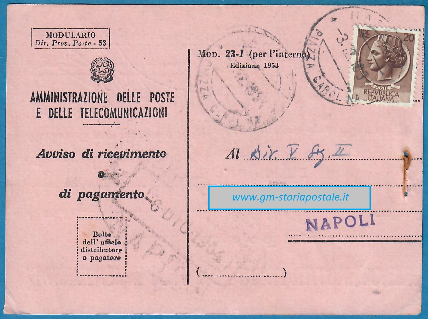 Tra il 10 aprile 1949 ed il 31 agosto 1959 la tariffa per affrancare un avviso di ricevimento era di 20 lire. L’esemplare sotto riportato fu spedito da Napoli il 3 dicembre 1954 in accompagnamento ad una raccomandata diretta in città e recapitata il giorno successivo.