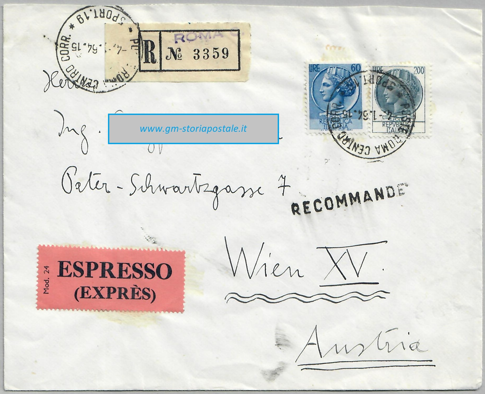 Tra il 1° luglio 1960 ed il 31 luglio 1965 la tariffa per affrancare una lettera primo porto per l’estero era di 70 lire; tra il 1° ottobre 1957 ed il 31 dicembre 1965 la sovrattassa per la raccomandazione di una corrispondenza diretta all’estero ammontava a 90 lire e tra il 1° ottobre 1957 ed il 31 luglio 1965 la sovrattassa per il recapito espresso di una corrispondenza diretta all’estero ammontava a 100 lire: vi fu quindi un periodo in cui la lettera per l’estero raccomandata espresso si affrancava con 70 + 90 + 100 = 260 lire. L’esemplare sotto riportato fu spedito da Roma il 4 gennaio 1964 per l’Austria, dove giunse il 6 gennaio successivo.
