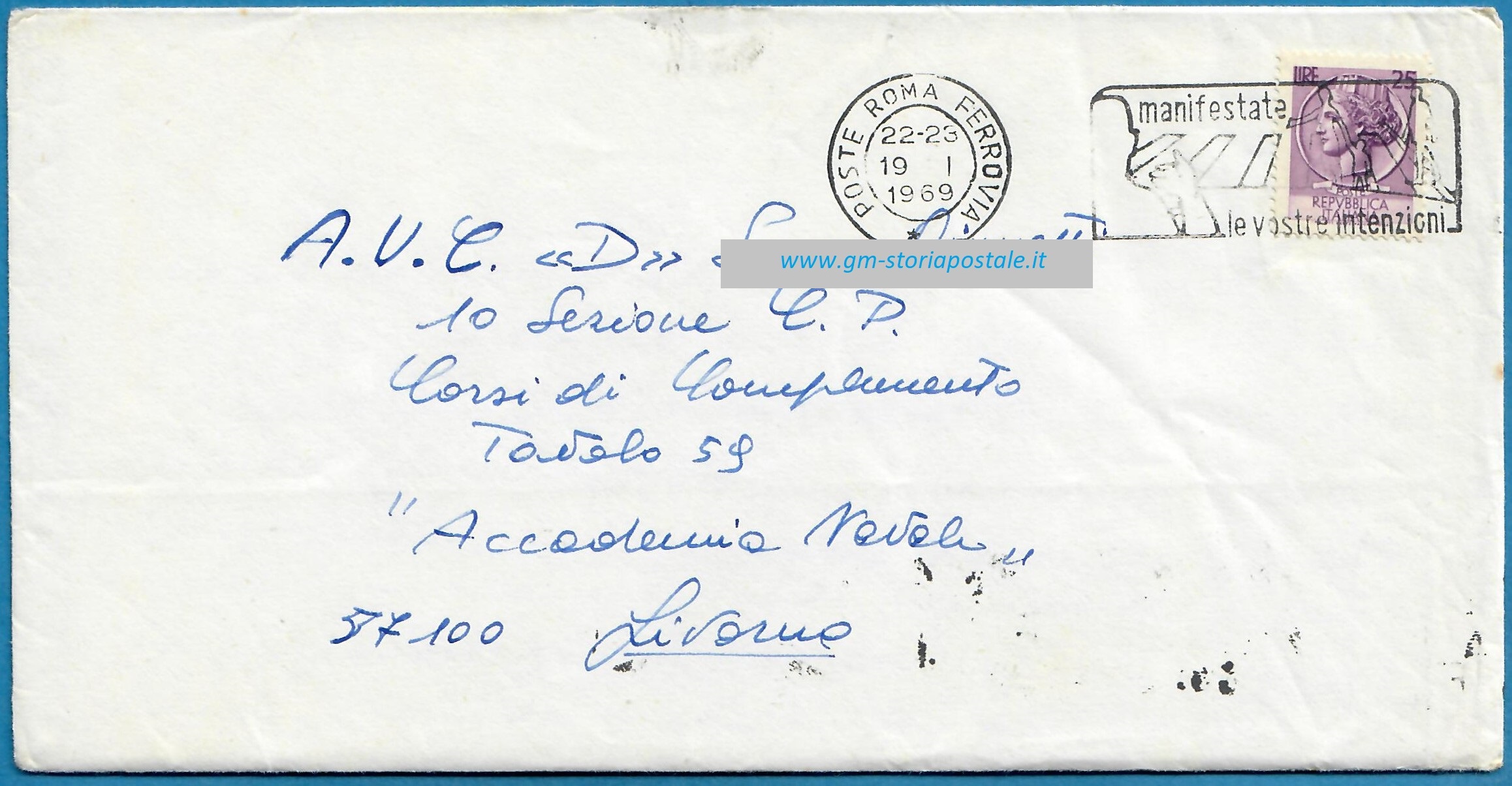 Tra il 16 agosto 1967 ed il 24 marzo 1975 la tariffa per affrancare una lettera diretta a militari era di 25 lire, pari alla riduzione del 50% della tariffa di 50 lire. L’esemplare sotto riportato fu spedito da Roma (annullo con targhetta) il 19 gennaio 1969 per Livorno, dove giunse il giorno successivo (datario con targhetta).