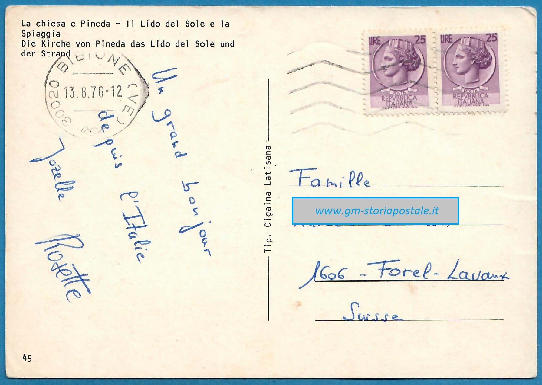 Tra il 25 marzo 1975 ed il 30 settembre 1976 la tariffa per affrancare una cartolina illustrata entro cinque parole per l’estero era di 50 lire. L’esemplare sotto riportato fu spedito da Bibione il 13 agosto 1976 per la Svizzera. Fluorescenza candida.