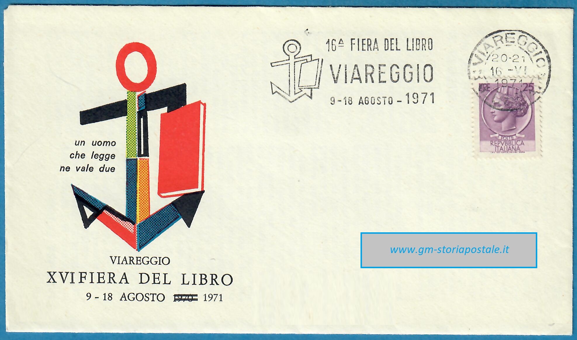 La busta non viaggiata sotto riportata ebbe il francobollo annullato con la targhetta in uso in occasione della Fiera del Libro di Viareggio del 1971.