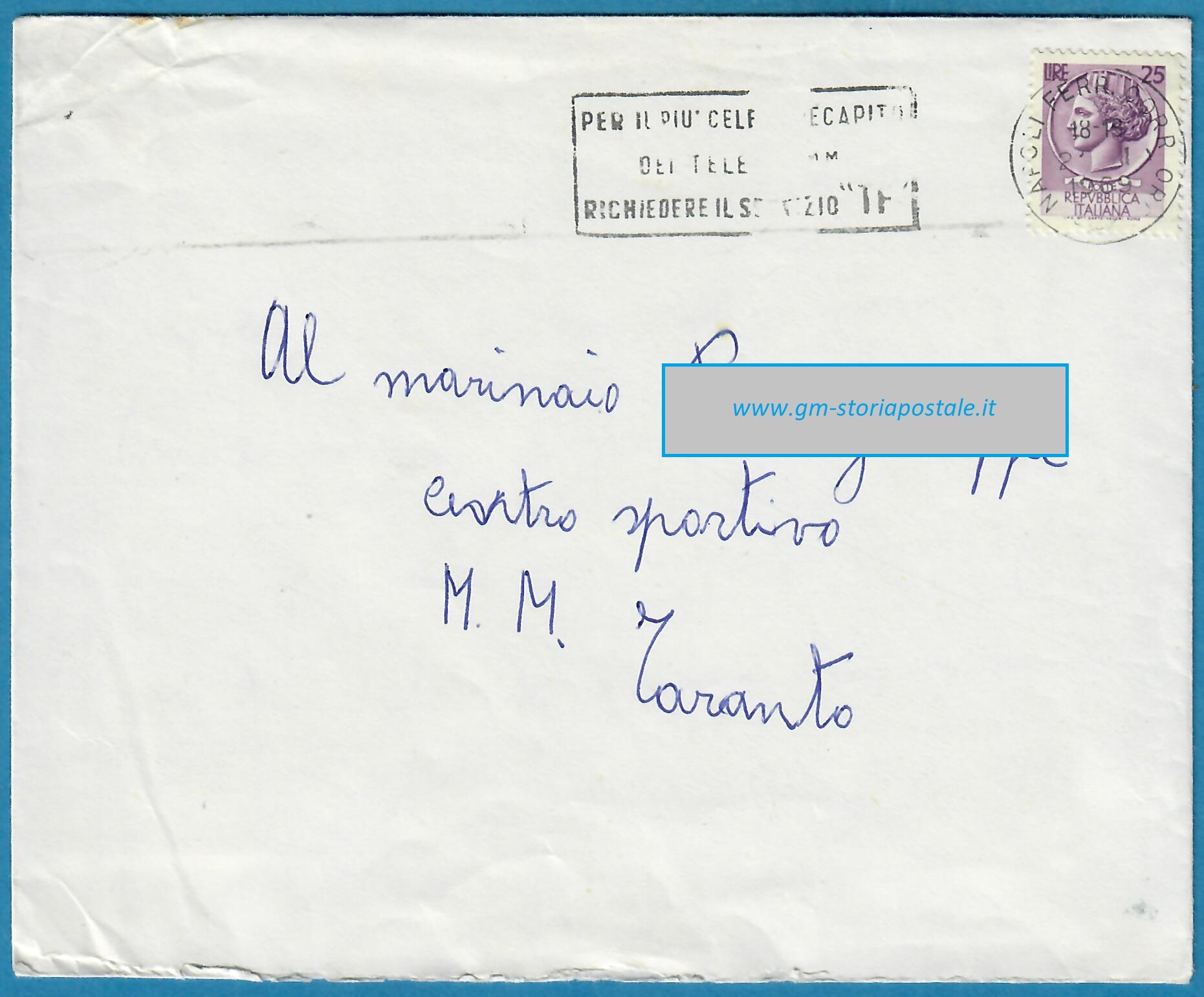 L’esemplare sotto riportato fu spedito da Napoli (annullo con targhetta) il 21 gennaio 1969 per Taranto.