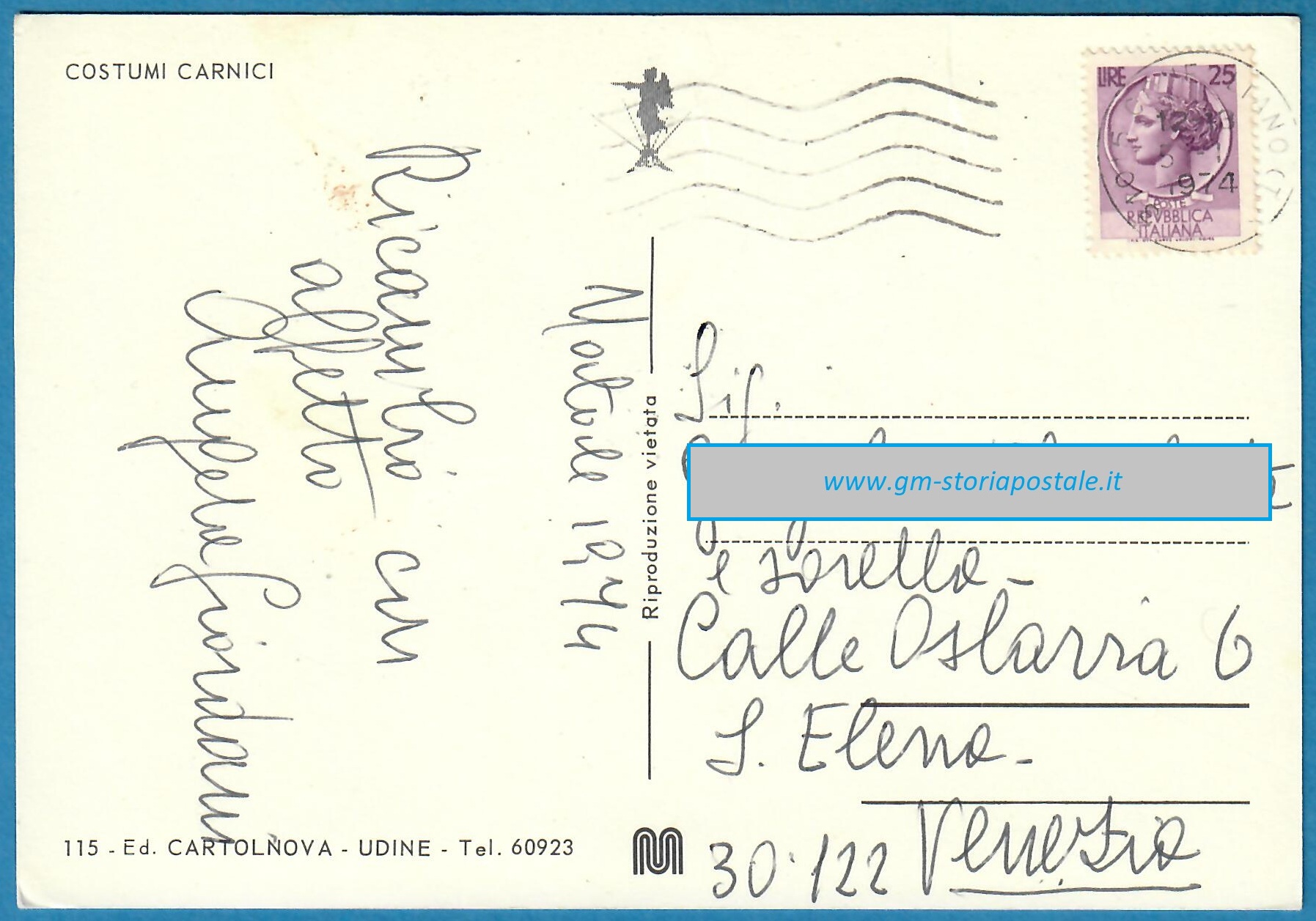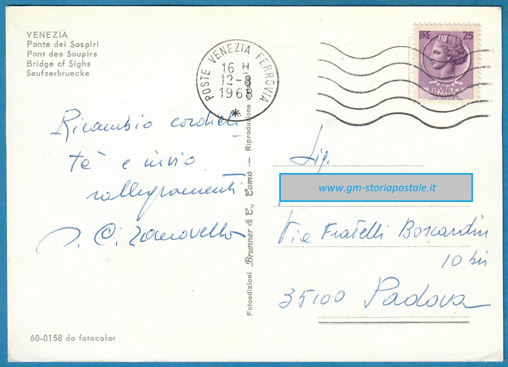 Tra il 16 agosto 1967 ed il 30 marzo 1974 la tariffa per affrancare una cartolina illustrata con testo inferiore a cinque parole di convenevoli era di 25 lire. L’esemplare sotto riportato fu spedito da Venezia il 12 agosto 1968 per Padova. Fluorescenza giallastra.