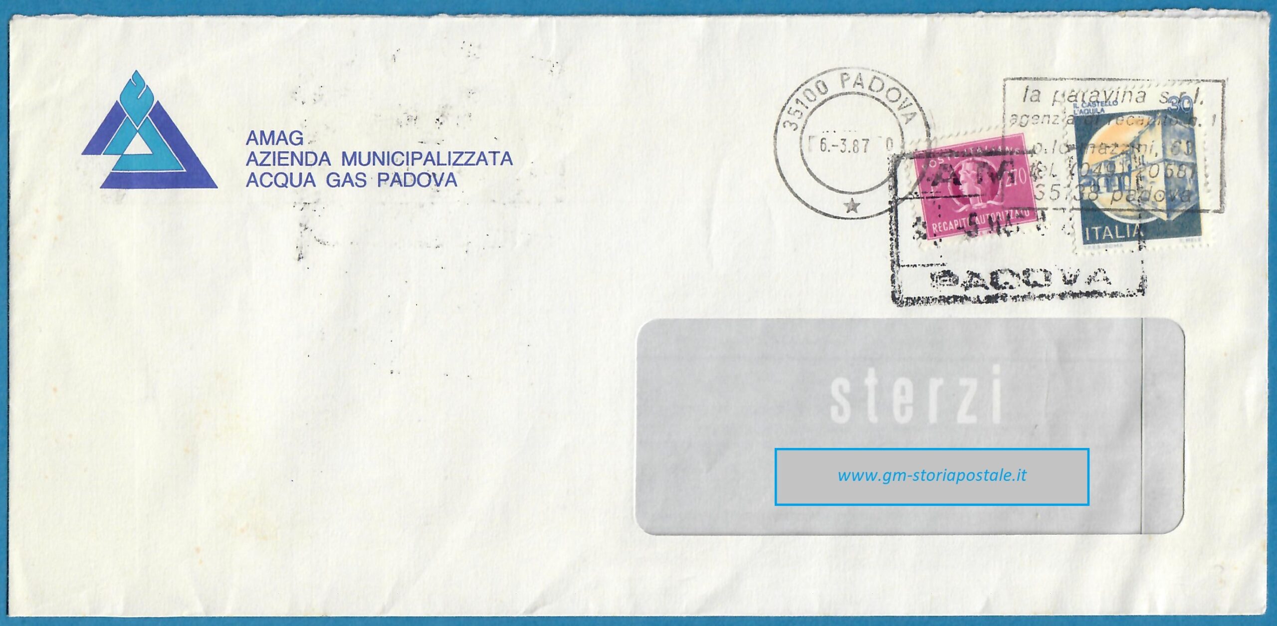 Tra il 13 novembre 1985 ed il 29 febbraio 1988 la il diritto postale per il recapito autorizzato ammontava a 300 lire. L’oggetto sotto riportato viaggiò a Padova il 6 marzo 1987.