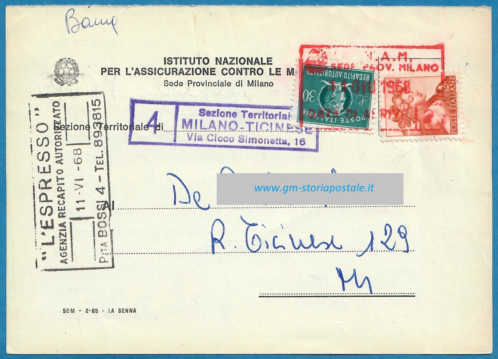 Tra il 16 agosto 1967 ed il 24 marzo 1975 il diritto postale per il recapito autorizzato ammontava a 35 lire. L’oggetto sotto riportato viaggiò a Milano l’11 giugno 1968.
