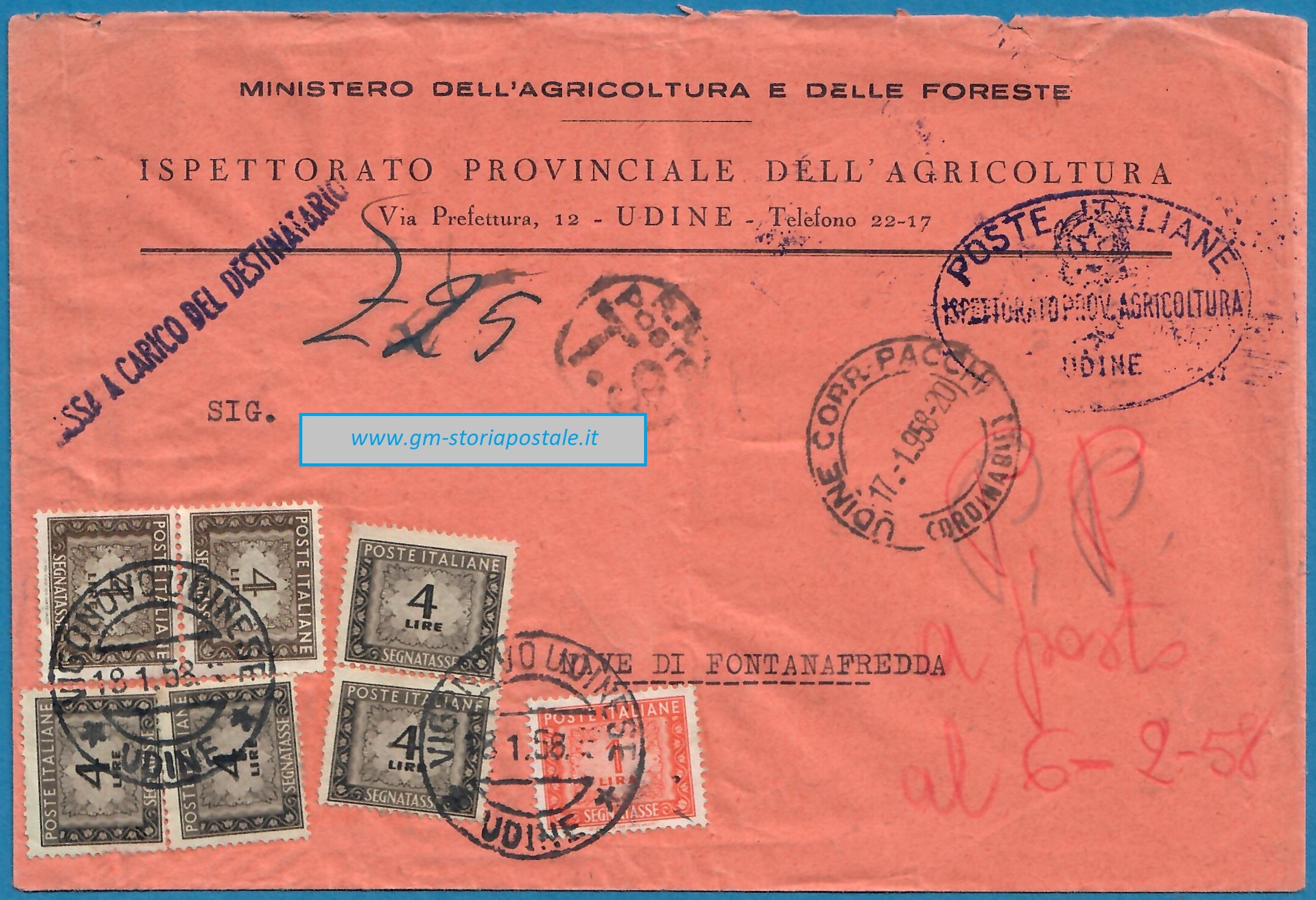 Tra il 1° agosto 1951 ed il 30 giugno 1960 la tariffa per affrancare una lettera primo porto per l’interno era di 25 lire. L’esemplare sotto riportato fu spedito a carico del destinatario da Udine il 17 gennaio 1958 per Nave di Fontanafredda e giunse a Vigonovo Udinese il giorno successivo. Nave è una delle frazioni del comune sparso di Fontanafredda: l’oggetto giunse alla frazione sede del Comune, ovvero Vigonovo Udinese, e lì fu tassato.