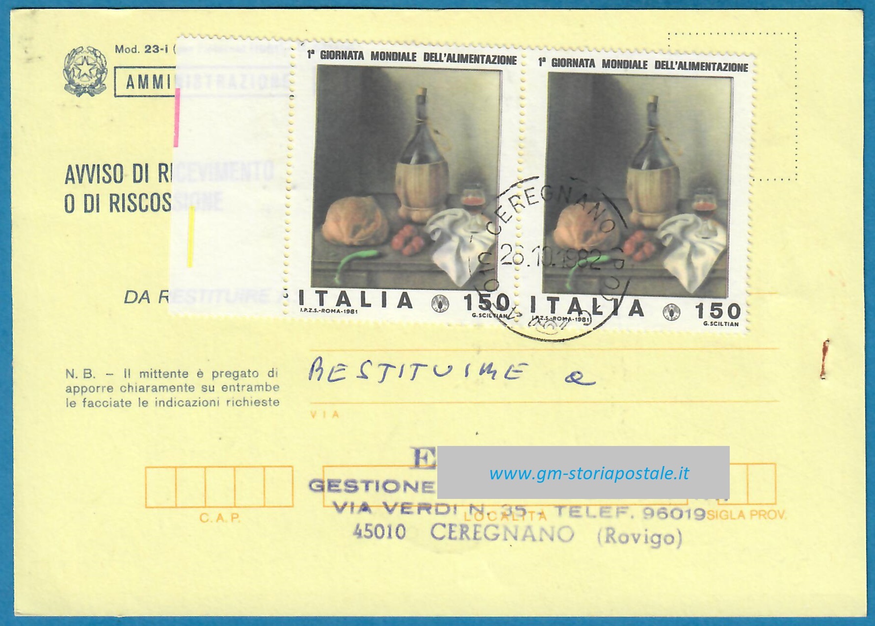 Tariffa 300 lire, Coppia del 150 lire Giornata Mondiale dell’Alimentazione – Ceregnano, 26 ottobre 1982:
