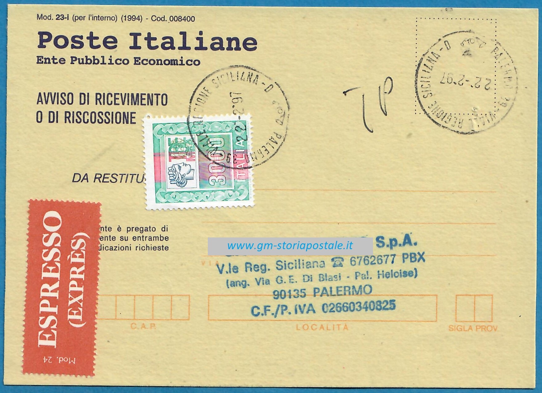 Soprattassa di 3000 lire per il recapito espresso (1° luglio 1990 – 4 maggio 1997) assolta con un esemplare del 3000 lire Alti Valori isolato; tariffa di 750 lire (1° luglio 1990 – 4 maggio 1997) assolta con affrancatura sull’oggetto raccomandato. Modello 23 con scritta “Poste Italiane”. Palermo, 22 febbraio 1997: